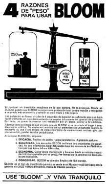 En la imagen número 4, se puede ver un anuncio publicitario de 1967. Corresponde a la segunda campaña en prensa escrita. Cruz Verde se dirige al consumidor aduciendo cuatro razones por las que debe comprar el insecticida. La razón más importante es que se trata de un producto económico y aporta datos. Se trata de un producto concentrado y se requiere gastar poco para desinsectar una habitación. En 4 segundos de aplicación se gastan 0’4 gramos de producto. Total 10 céntimos de las 45 pesetas que costaba. Lo escrito se refuerza de una manera visual con la imagen de una balanza que se decanta por Bloom. En este anuncio ya aparece la mosca cayendo en barrena en la etiqueta. Las letras están en la parte inferior. Importante es que el anuncio incluye un buen eslogan: «Use Bloom y viva tranquilo.»
