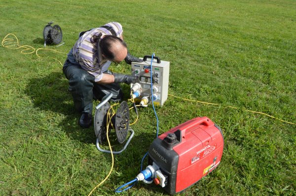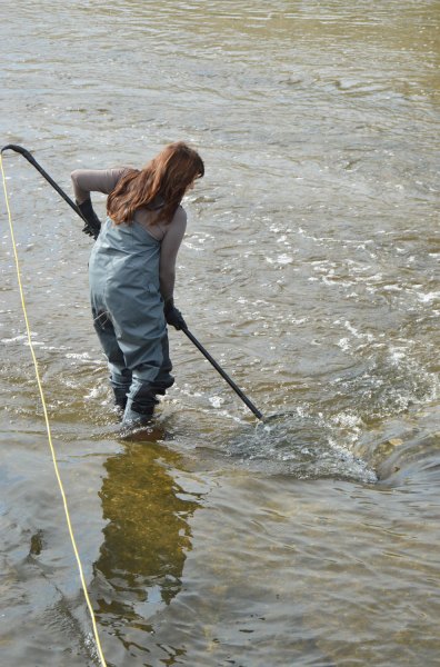 Como antes decía, la científica responsable era Dolors Vinyoles quien tenía un perfecto ayudante llamado Domingo. En la imagen número 2 se le puede ver a él ajustando el amperaje en la central que rige las descargas eléctricas. De lo que se trataba era de pescar todo lo que hubiera en un determinado tramo del río. Y para ello no hay otra técnica viable y que produzca el menor daño en los peces que la pesca eléctrica [3]. Para ello es necesario un generador de corriente, una central de electrocaptura, un cableado y un par de electrodos. Uno de los electrodos consiste en una cinta metálica que han llevado río abajo de donde estaban situados el generador y la central. Lo han llevado cosa de unos 15 metros y lo han sumergido en el agua. El otro electrodo se puede ver en la imagen número 3. Consiste en un salabre metálico que contiene un interruptor que se pulsa para producir la descarga. Según me han indicado, el amperaje suele ser de 1’5 amperios.