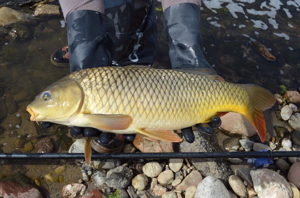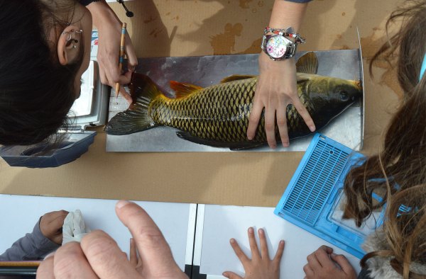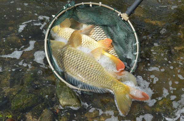 Armados de sus instrumentos de pesca han ido buscando los peces por la orilla. El primer lugar donde han buscado ha sido a la altura del parque de Can Zam en donde el agua cubre poco. Allí han pescado básicamente anguilas, Anguilla anguilla, y algunas bagras catalanas, Squalius laietanus. De ambas especies se pueden ver fotografías más abajo. Comentar que la bagra catalana es una especie endémica del nordeste de la Península Ibérica y que puede llegar a medir unos 25 centímetros. Después de pescar en esta zona, se han trasladado unos 100 metros río arriba al pie del azud. Allí hay un poco más de profundidad donde encontrar carpas, Cyprinus carpio. Al poco de meterse en el agua ya encontraban unas hermosas carpas (figuras 6, 7 y 8). Como se puede ver, en uno de los salabres llevaban 3 carpas. ¡Qué maravilla de animal! Espero se aprecie su belleza en las fotografías. Me han explicado que se trata de una especie alóctona que introdujeron los romanos con fines ornamentales para estanques. Pueden llegar a medir entre 50 y 60 centímetros.