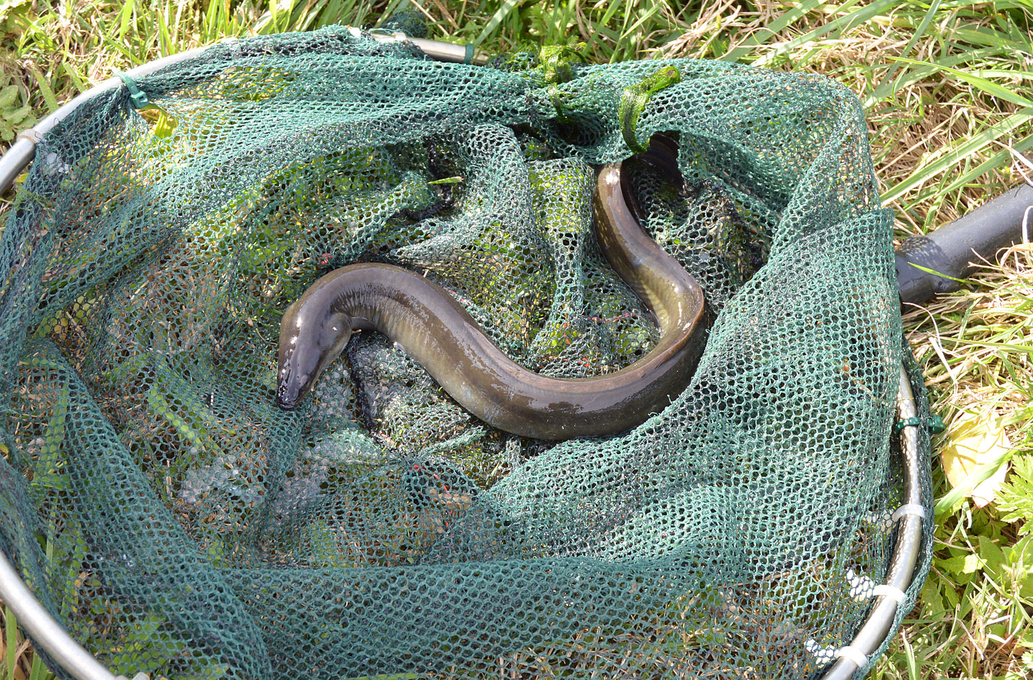 Armados de sus instrumentos de pesca han ido buscando los peces por la orilla. El primer lugar donde han buscado ha sido a la altura del parque de Can Zam en donde el agua cubre poco. Allí han pescado básicamente anguilas, Anguilla anguilla, y algunas bagras catalanas, Squalius laietanus. De ambas especies se pueden ver fotografías más abajo. Comentar que la bagra catalana es una especie endémica del nordeste de la Península Ibérica y que puede llegar a medir unos 25 centímetros. Después de pescar en esta zona, se han trasladado unos 100 metros río arriba al pie del azud. Allí hay un poco más de profundidad donde encontrar carpas, Cyprinus carpio. Al poco de meterse en el agua ya encontraban unas hermosas carpas (figuras 6, 7 y 8). Como se puede ver, en uno de los salabres llevaban 3 carpas. ¡Qué maravilla de animal! Espero se aprecie su belleza en las fotografías. Me han explicado que se trata de una especie alóctona que introdujeron los romanos con fines ornamentales para estanques. Pueden llegar a medir entre 50 y 60 centímetros.
