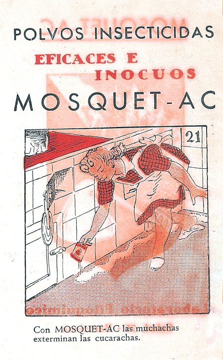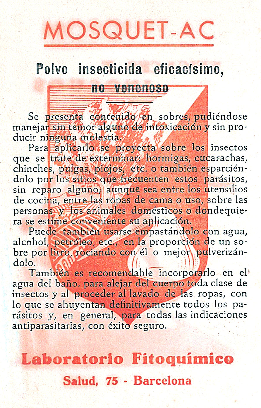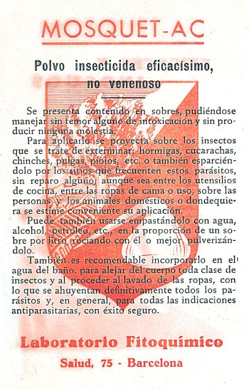 Esta tarde he ido a buscar a la oficina de Correos un sobre en el que venía una hoja publicitaria que compré la semana pasada. Se trata de una pequeña impresión de 8 por 12 centímetros donde se explican las bondades del insecticida MOSQUET-AC fabricado por Laboratorios Fitoquímicos. En el anverso (figura 1), se puede ver a la imagen de una muchacha espolvoreando el suelo con los polvos insecticidas. Son calificados de «eficaces e inocuos». Y por lo que se desprende de la imagen son, además, de fácil aplicación. Cosas de la época. Como se puede ver, se recogen los tópicos con los que se publicitaban los insecticidas antes. Tan solo falta el no mancha que no se dice porque se aplican por medio de espolvoreo.