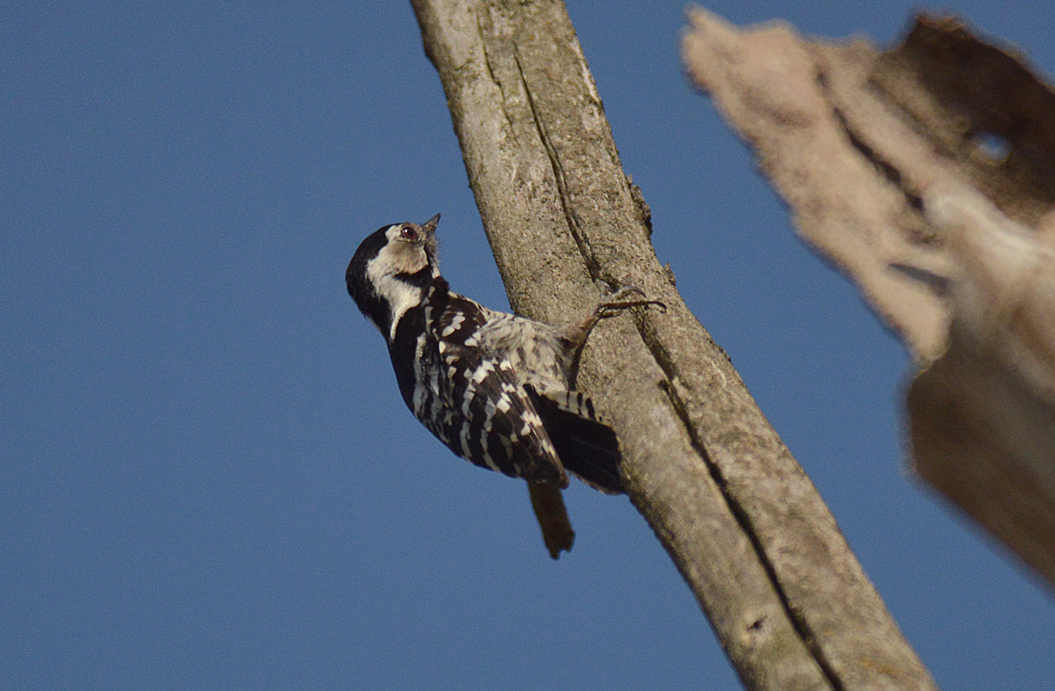 El pasado sábado tuve la suerte de encontrarme con un ave escasa. Iba con mi mujer paseando junto al cauce del río Besós a la altura de la Llagosta. En un árbol vimos un pájaro que nos llamó la atención. Cogí la cámara para poder observarlo a través del teleobjetivo. Me pareció ver un macho de picapinos, Dendrocopos major, ya que tenía roja la parte superior de la cabeza. Nos pusimos a observar los árboles cercanos y vimos un par que estaban muertos y con el tronco pelado (figura 8). Sobre la corteza había muchos agujeros de salida de coleópteros xilófagos. Supuse que sería un buen lugar para que este pájaro encontrara alimento (larvas) y establecer allí su nido. En la parte superior del más cercano, vimos otro pájaro similar al cual le hice unas fotografías (figuras 1 a 4). Pero a diferencia del anterior no tenía el píleo rojo, por lo cual dedujimos que se trataba de la hembra. Al ver que nos íbamos acercando más, echó a volar.