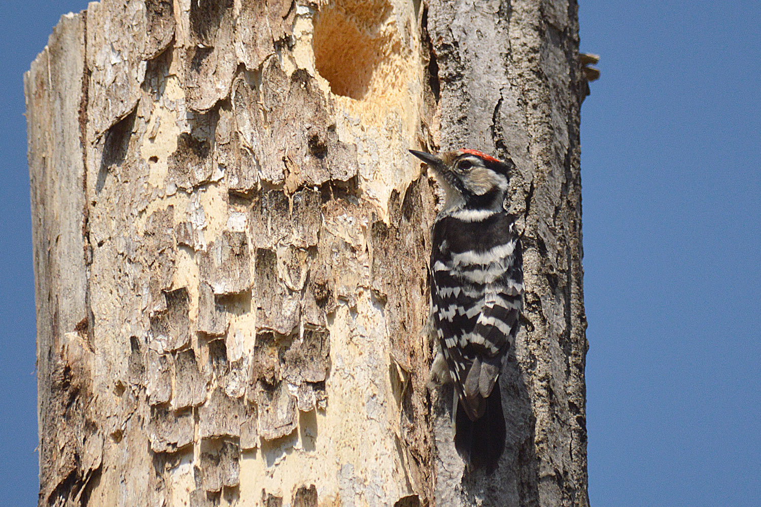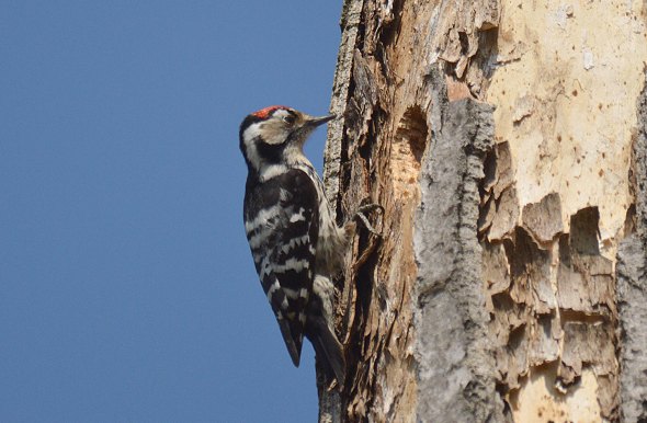 Observando el árbol muerto, vi que había varios agujeros hechos por este pájaro. Pero en la parte más alta había uno bien gordo. Posiblemente se trataba de la entrada al nido. Decidimos esperar para ver si regresaban y poder hacer más fotos. Al cabo de un rato, se posó el macho y le pude hacer unas fotos (figuras 5 a 7). Este trepó hasta situarse delante de la entrada del nido. Pero no penetró, ya que estábamos nosotros cerca. Y acabó marchando. Cuando llegué a casa, me puse a buscar información para su identificación. Con la ayuda de un Cuaderno de Campo del Dr. Félix Rodríguez de la Fuente dedicado a los pájaros carpinteros [1], llegué a la conclusión de que se trataba de un pico menor, Dendrocopos minor. Se trata del más pequeño de los carpinteros (pícidos) con unos 15 centímetros de largo. Espero que se pueda apreciar la belleza de este ave a través de las imágenes.