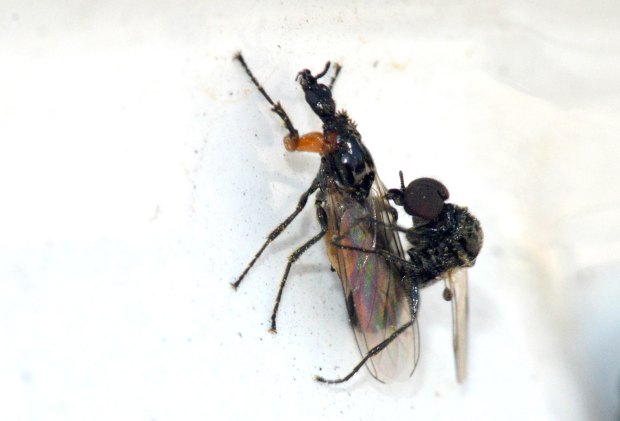Hace unos días me encontré un bibiónido (Bibionidae). Me acerqué poco a poco para tomar unas fotografías. Estaba sobre una pared a la altura de mis ojos. Por suerte, no alzó el vuelo. Obervé con detalle la forma. Es un insecto muy bello. Me llamó la atención las forma robusta de las patas delanteras (figura 1). Destacan los dos primeros segmentos de color rojo. Buscando información he llegado a la conclusión de que se trata probablemente de una hembra de Dilophus femoratus. El macho se diferencia por ser un poco más pequeño, por tener unos ojos muchos más grandes y por carecer de un tórax brillante. En las imágenes 4 a 7 de puede ver al macho copulando con una hembra.