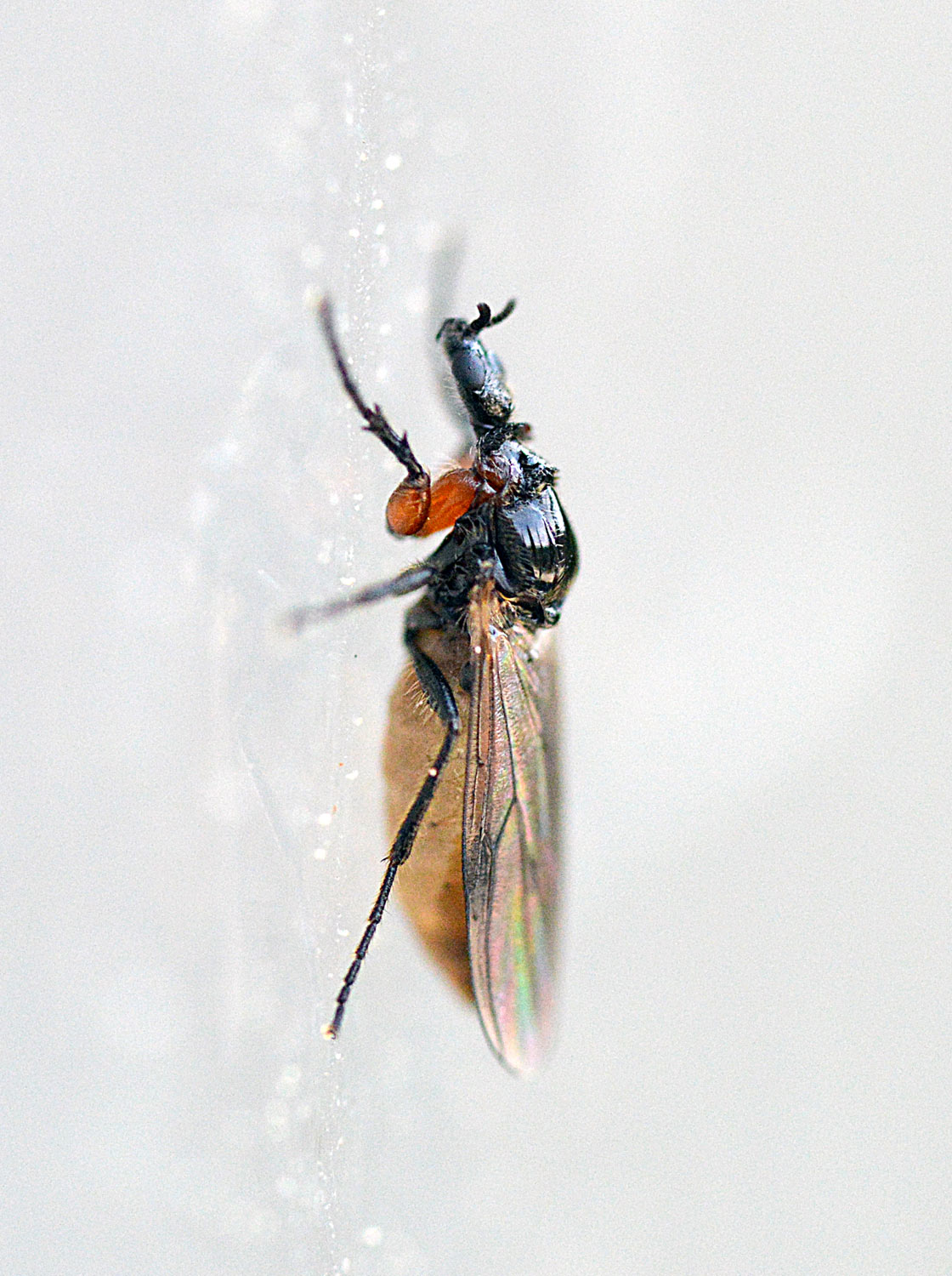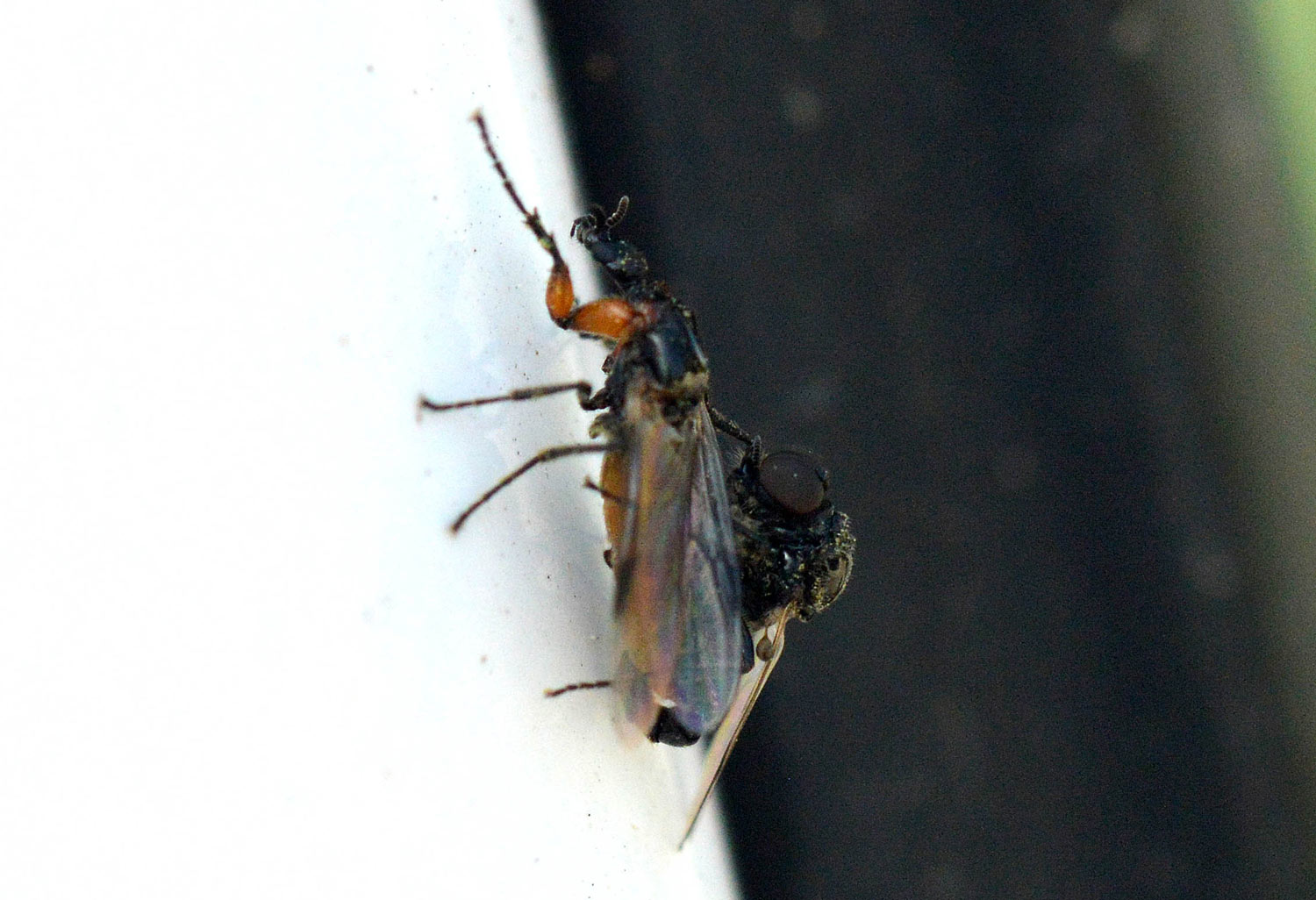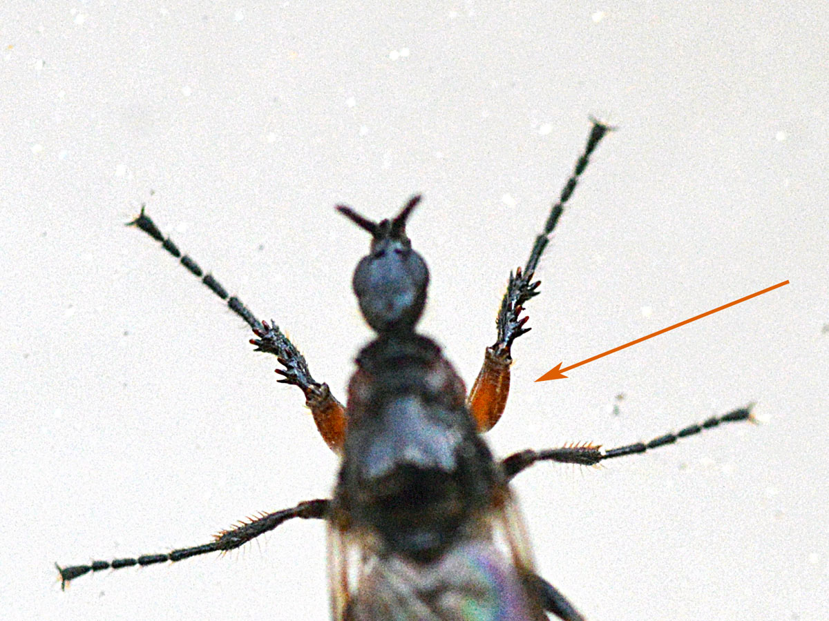 Hace unos días me encontré un bibiónido (Bibionidae). Me acerqué poco a poco para tomar unas fotografías. Estaba sobre una pared a la altura de mis ojos. Por suerte, no alzó el vuelo. Obervé con detalle la forma. Es un insecto muy bello. Me llamó la atención las forma robusta de las patas delanteras (figura 1). Destacan los dos primeros segmentos de color rojo. Buscando información he llegado a la conclusión de que se trata probablemente de una hembra de Dilophus femoratus. El macho se diferencia por ser un poco más pequeño, por tener unos ojos muchos más grandes y por carecer de un tórax brillante. En las imágenes 4 a 7 de puede ver al macho copulando con una hembra.