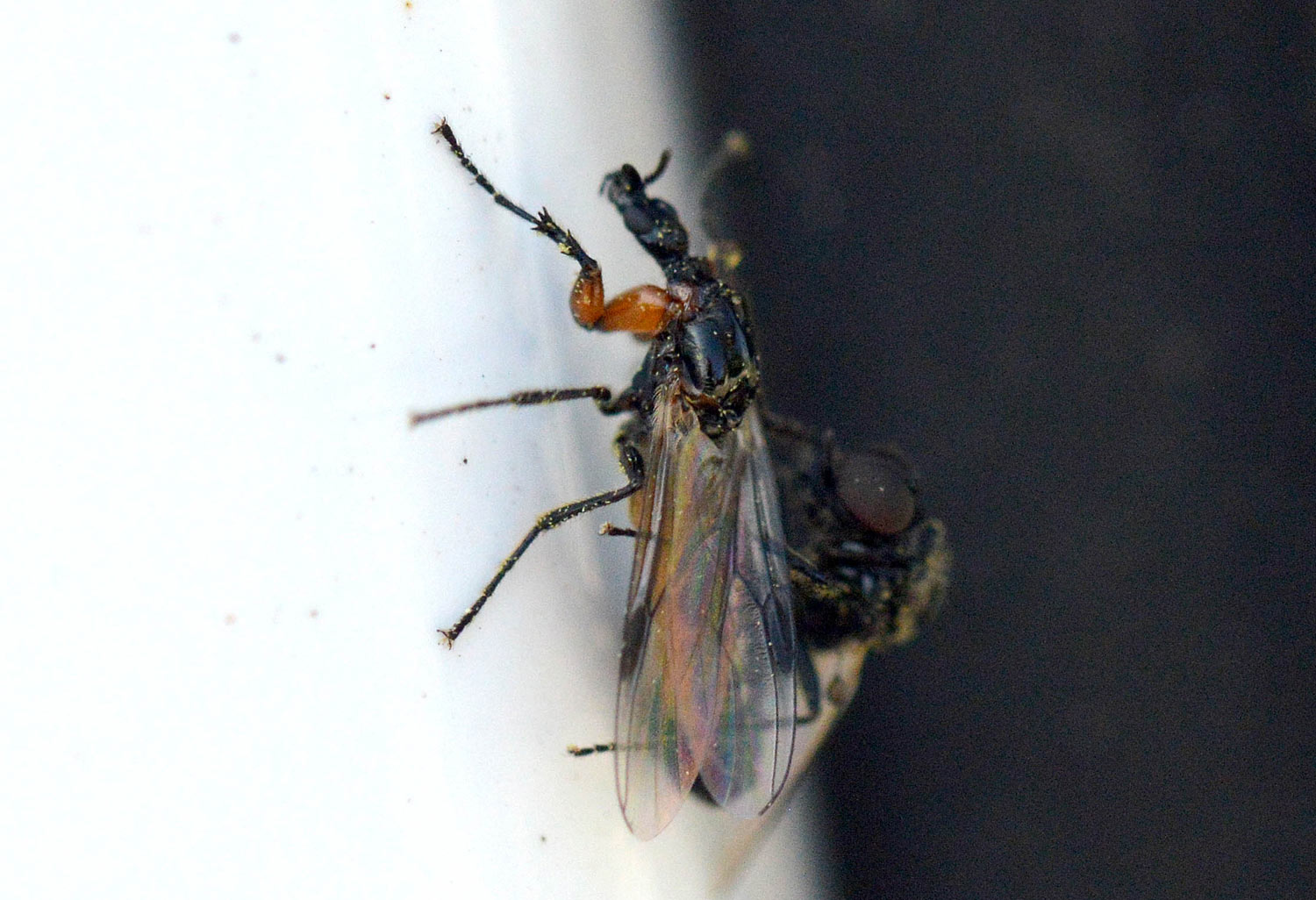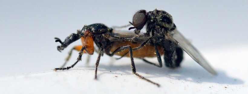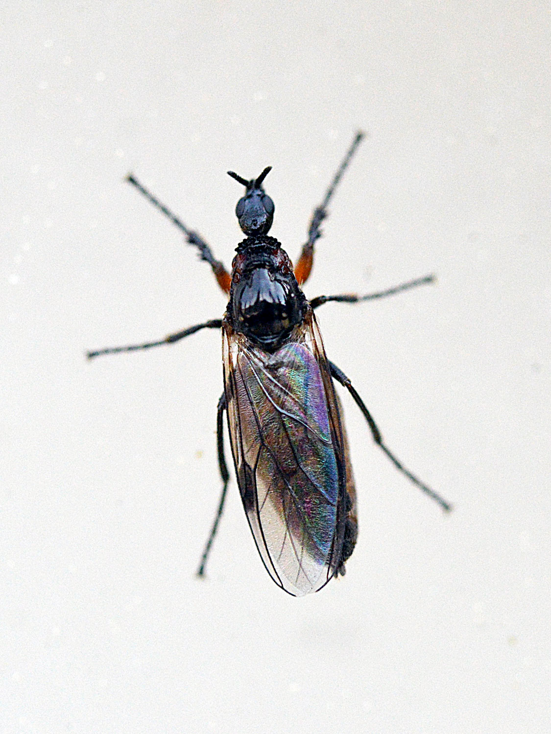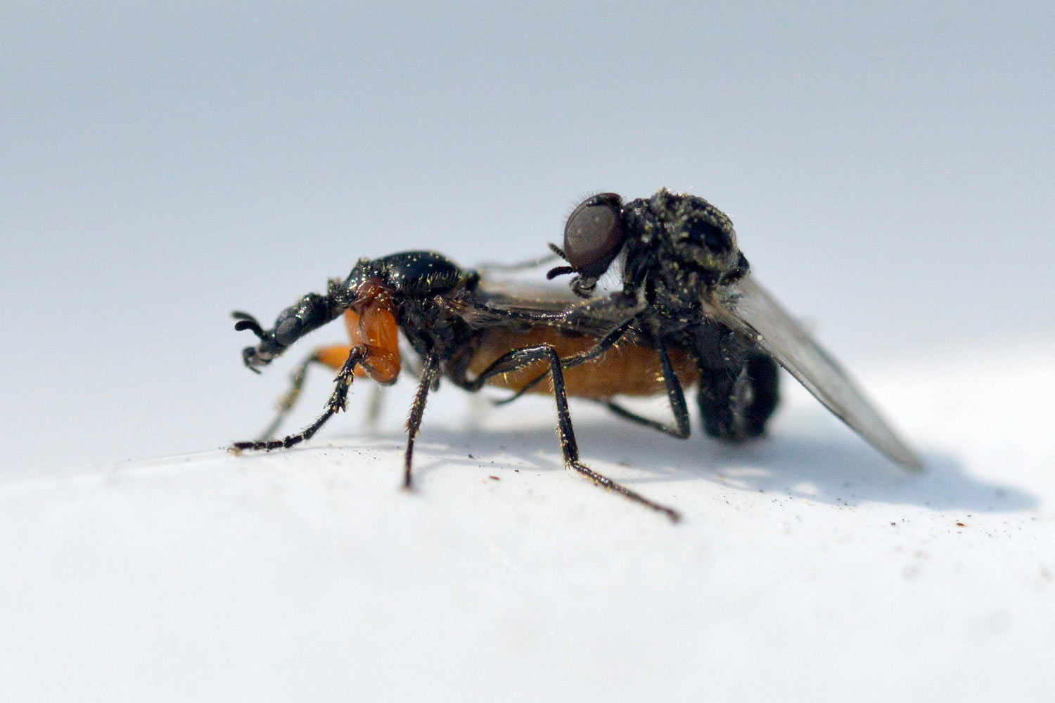 Hace unos días me encontré un bibiónido (Bibionidae). Me acerqué poco a poco para tomar unas fotografías. Estaba sobre una pared a la altura de mis ojos. Por suerte, no alzó el vuelo. Obervé con detalle la forma. Es un insecto muy bello. Me llamó la atención las forma robusta de las patas delanteras (figura 1). Destacan los dos primeros segmentos de color rojo. Buscando información he llegado a la conclusión de que se trata probablemente de una hembra de Dilophus femoratus. El macho se diferencia por ser un poco más pequeño, por tener unos ojos muchos más grandes y por carecer de un tórax brillante. En las imágenes 4 a 7 de puede ver al macho copulando con una hembra.