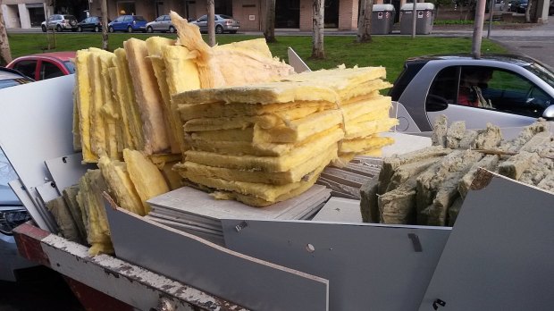Hace unos días caminaba hacia el trabajo cuando pasé ante un contenedor de obra. Al ver su contenido, me paré. Lo que vi no me gustó. Sobresalían unos fardos de lana de vidrio [1] y otros de lana de roca [2]. También había placas de falso techo. Deduje que en el edificio cercano estaban haciendo la reforma de unas oficinas. Pensé que con la retirada de este tipo de material aislante las nuevas oficinas ganarían en un ambiente más seguro para las personas.