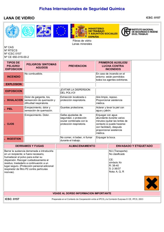 Fig 5. Ficha Internacional de Seguridad Química para la Lana de Vidrio, versión 2003, pág 2.