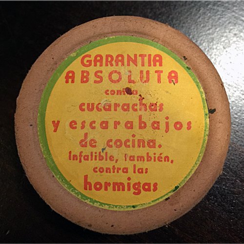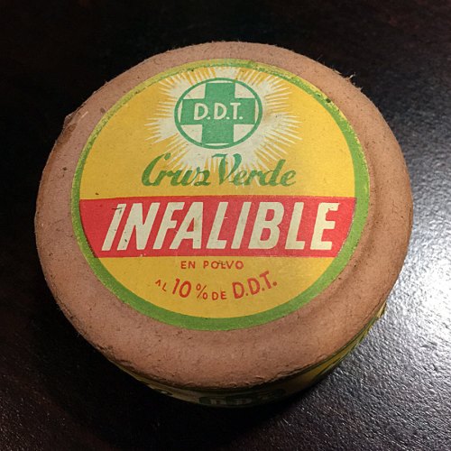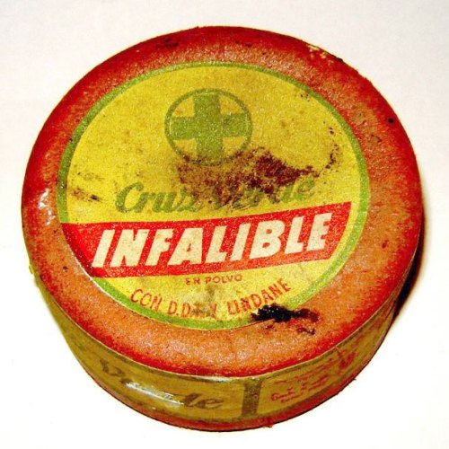 Manuel Pérez de Astur Higiene (basturhigiene.com) me ha enviado seis imágenes de un añejo producto insecticida llamado INFALIBLE. Como se puede ver, ha tomado fotografías de detalle que permiten leer todo el contenido de la etiqueta. Empezaré por comentar lo obvio y es que INFALIBLE era un insecticida en polvo formulado con DDT al 10% (figura 1). El envase redondo era de los llamados de tipo fuelle. Cuando uno compraba este producto, junto al envase se suministraba un clavito que hacía la función de tapón. Se debía perforar el envase por el lugar indicado. En la imagen número 4 se puede ver el clavito. Para usarlo, se retiraba el clavo y se presionaba con los dedos el envase para que saliera el producto. La caja fuelle fue muy popular desde principios del siglo XX para dispensar polvos insecticidas [1]. Antes de la aparición de este envase, se usaban fuelles como los usados para avivar el fuego.