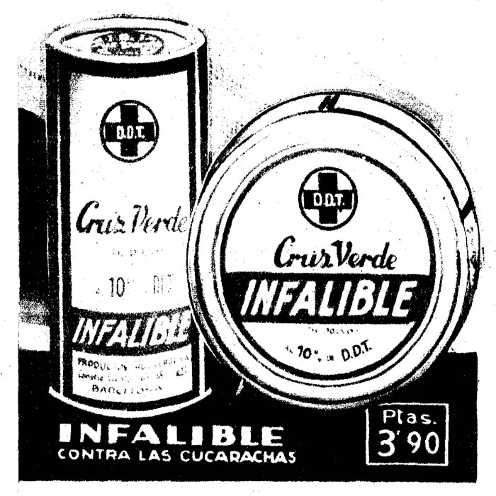 Para acabar, comentar que no sé en qué año Cruz Verde dejó de comercializar Infalible. Este producto estaba ligado al DDT. Así que, a principios de la década de 1960 es cuando empezó a declinar su uso por otras materias activas más modernas. Por otra parte, en aquella época Cruz Verde ya tenía otras marcas como Cucal que presentaban una imagen más moderna y con un nombre más comercial [5].