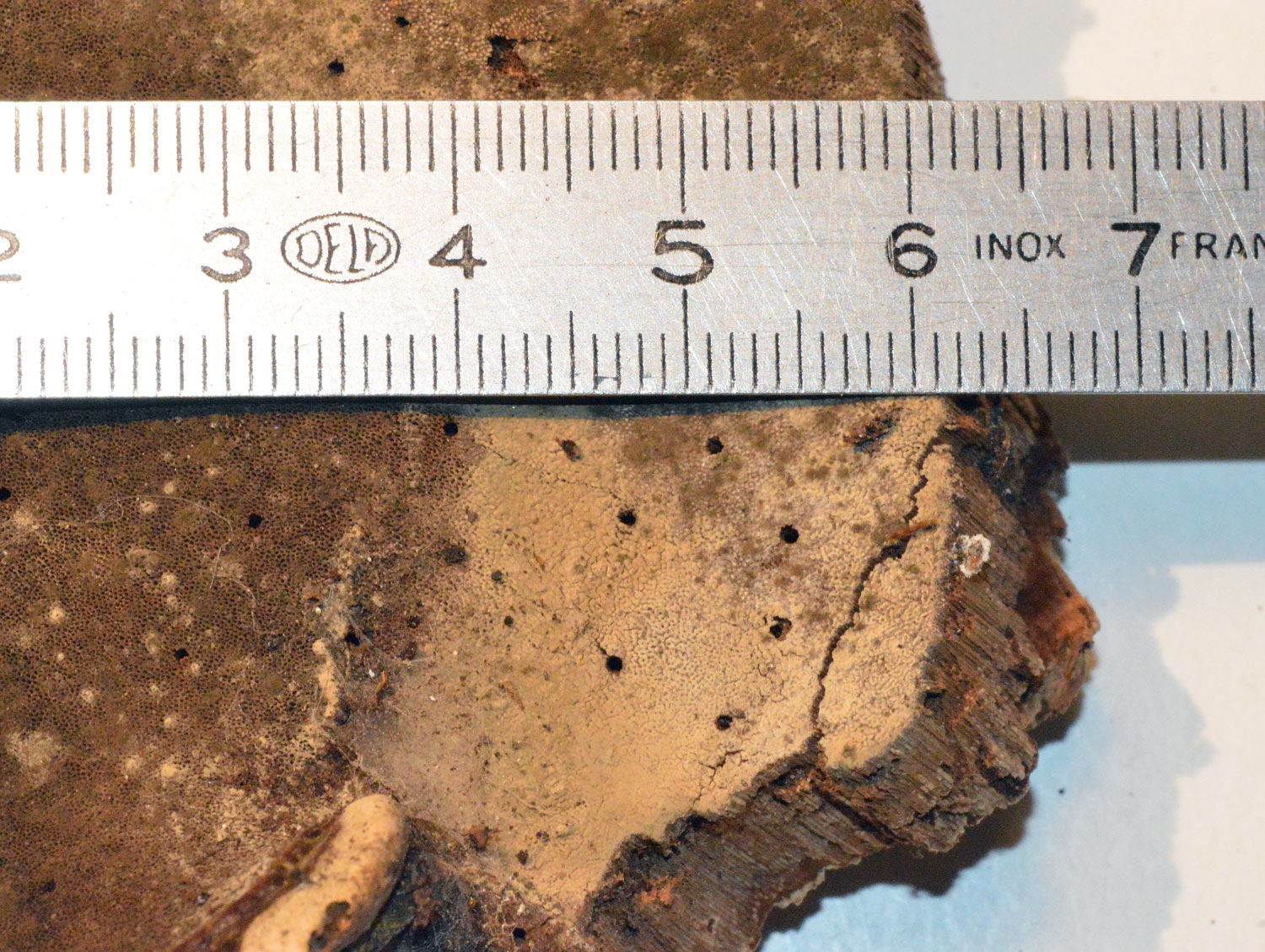 Además de insectos, también están presentes los hongos xilófagos. En la vieja morera que tenía ante mí había un gran hongo de repisa de un palmo de ancho (figuras 2 y 3). Me puse a observarlo y vi que tenía pequeñas perforaciones de salida (figuras 4 y 5). Aunque estas eran más abundantes en la parte inferior que en la superior. Qué interesante, me dije. Así que me puse a mirar con detalle y vi un pequeño coleóptero de poco más de un milímetro. Me pregunté si se trataba del insecto que estaba minando el cuerpo de fructificación. Entonces rompí un trozo del hongo y vi galerías. En una de ellas vi un coleóptero parecido al anterior. Decidí llevarme un buen trozo del hongo a casa para poder mirar con detalle todo este interesante asunto.