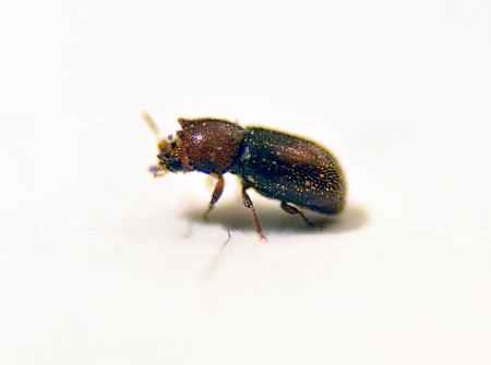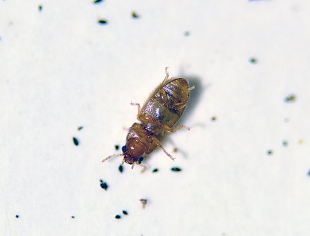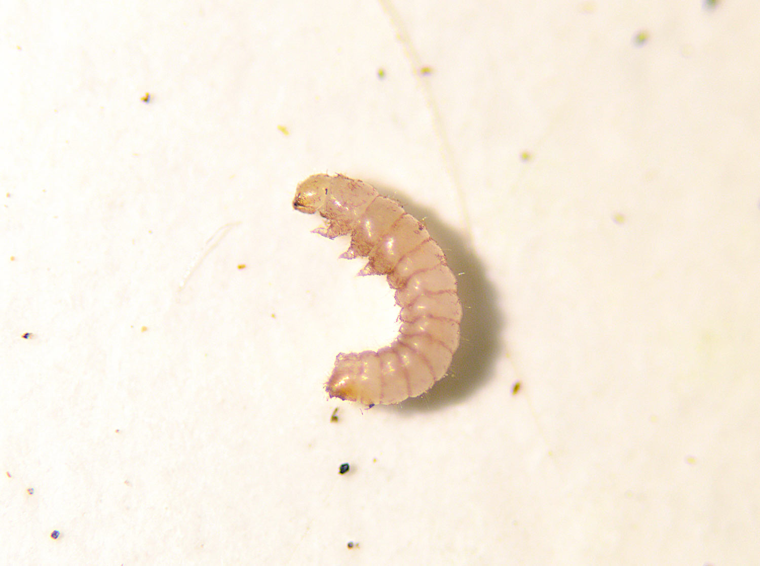 Cuando tuve un momento en casa, desmenucé el hongo para hacerme con algunos ejemplares de este escarabajo. Me di cuenta que había de dos tipos diferentes. Unos con cuernos en el extremo del pronoto y de la cabeza (fig. 7, 8 y 9) y otros sin cuernos (fig. 10, 11, y 12). Aunque ambos tipos eran muy parecidos en color y forma. Tenía dos posibilidades. O estaba ante dos especies diferentes o ante un caso de dimorfismo sexual. Me pareció lógico el segundo caso. Quizás los cornudos fueran los machos. A la hora de su identificación me pareció que estaba ante alguna especie de anóbido (Anobiidae). Pero tenía en contra dos hechos. Uno, el que hubiera algunos que fueran cornudos. Dos, el que las larvas que encontré no parecían de anóbidos (figura 13). Después de un rato de búsqueda, encontré que los escarabajos pertenecían a la familia de los ciícedos (Ciidae), conocidos como escarabajos de hongos de repisa. Se trata de unos insectos que realizan todo su ciclo de vida ligado a los hongos poliporáceos (Polyporales) [1]. Dentro de este orden de hongos se encuentra el conocido hongo destructor Merulius lacrymans.