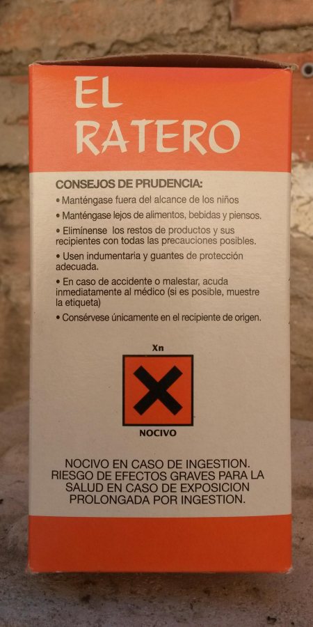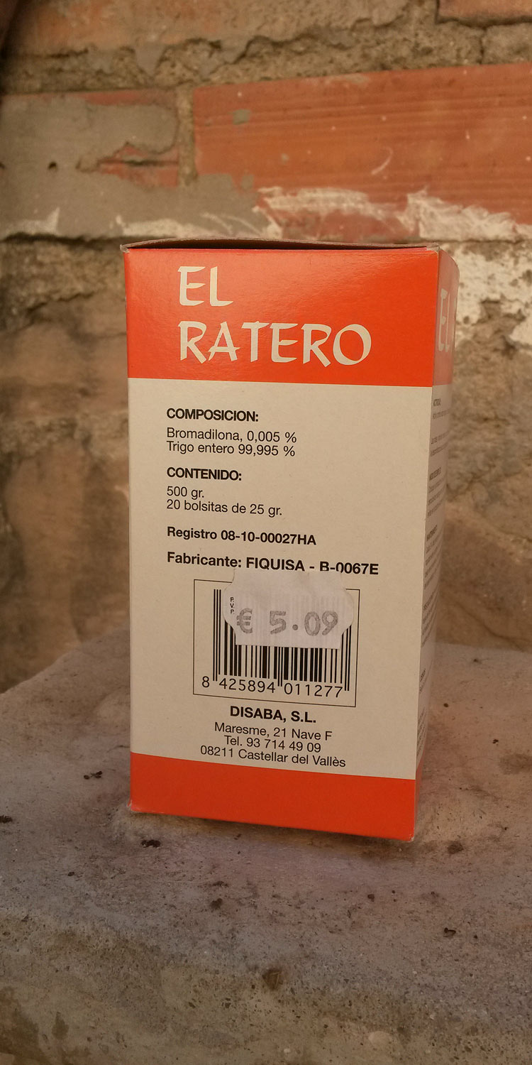 Hace unos meses encontré en casa de un cliente una caja del producto rodenticida El Ratero. Un nombre no muy adecuado, puesto que en español un ratero es una persona que se dedica al hurto y no a la desratización. El término correcto sería desratizador. El Ratero está fabricado por Fitosanitarios Químicos SA (FIQUISA) [1] y comercializado por Distribuciones Saba SL (DISABA) de Castellar del Vallès. Este tipo de producto fabricado para terceros recibe el nombre de maquila, pues es fabricado por una empresa experta en ello y comercializado por otra que no lo es. Maquilas vienen a ser los productos insecticidas de marca blanca que podemos ver en los estantes de grandes supermercados.