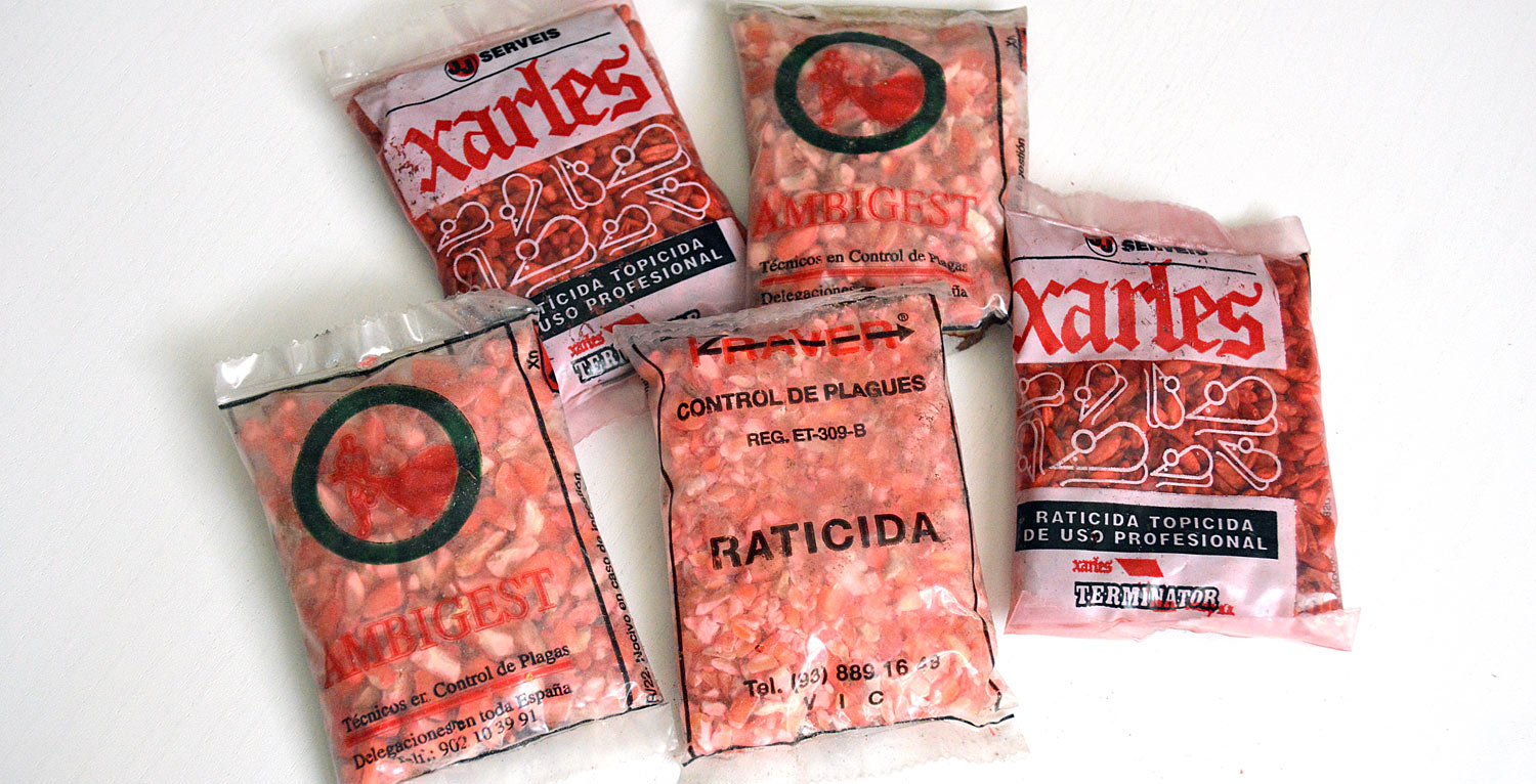 Otros ejemplos de la misma empresa se pueden ver en la imagen número 1. Son bolsitas de rodenticida en grano que me he ido encontrando en clientes y que tengo guardadas. Como se puede ver, están rotuladas con el nombre y logotipo de empresas de control de plagas. La de Ambigest y la de Traver (Tractaments Verdaguer) tienen el número de registro 28 que corresponde al B-D RATICIDA BROMADIOLONA 10. La de Xarles (Xarles Terminator Europ) tiene el número 22 que corresponde al B-D RATICIDA CLOROFACINONA-7 EN SEMILLAS.