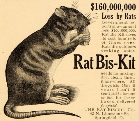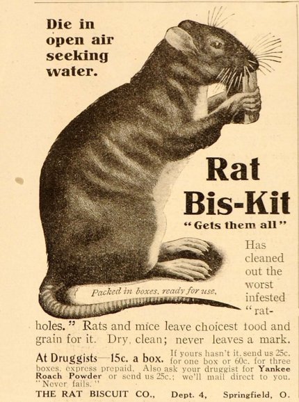 Interesante es el producto rodenticida norteamericano llamado Rat Bis-Kit que se puede traducir como galleta de rata. Y en esto consistía, en un formulado en cebo listo para su uso, sin la necesidad de ninguna manipulación. Hoy en día estamos acostumbrados a aplicar los rodenticidas de una manera rápida. Los cebos ya vienen preparados y tan solo hay que cogerlos y ponerlos en un portacebos. Pero antaño esto no era lo normal. El cebo había que prepararlo. Muy habitual eran las pastas a base de fósforo o arsénico con las que se untaban trozos de pan. Rat Bis-Kit parece que fue lanzado por The Rat Bis-Kit Company de Springfield Ohio a principios del siglo XX. Es por tanto muy remarcable su originalidad. Por el momento, no he encontrado ningún otro rodenticida similar más antiguo.