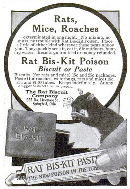 Interesante es el producto rodenticida norteamericano llamado Rat Bis-Kit que se puede traducir como galleta de rata. Y en esto consistía, en un formulado en cebo listo para su uso, sin la necesidad de ninguna manipulación. Hoy en día estamos acostumbrados a aplicar los rodenticidas de una manera rápida. Los cebos ya vienen preparados y tan solo hay que cogerlos y ponerlos en un portacebos. Pero antaño esto no era lo normal. El cebo había que prepararlo. Muy habitual eran las pastas a base de fósforo o arsénico con las que se untaban trozos de pan. Rat Bis-Kit parece que fue lanzado por The Rat Bis-Kit Company de Springfield Ohio a principios del siglo XX. Es por tanto muy remarcable su originalidad. Por el momento, no he encontrado ningún otro rodenticida similar más antiguo.