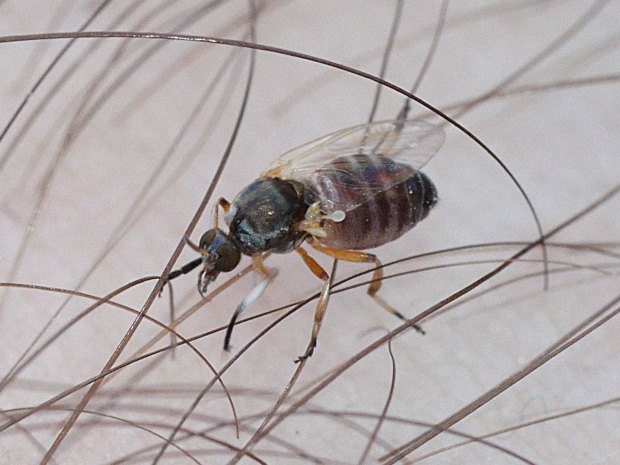 Estaba bien gordo por la sangre que me había chupado. También tenía un ala rota. Imagino que se la rompí yo al cogerlo para observarlo. Esto me ha ido muy bien porque era incapaz de emprender el vuelo y me ha permitido hacerle fotografías. Una duda que tengo es si además de este me ha picado otro, porque después de estar entretenido con el que he cazado me he vuelto a mirar la piernas y me he visto una herida muy parecida y con una gota de sangre en la otra pierna. Los simúlidos son unos insectos más groseros que sus parientes los mosquitos. Eso sí, cuando te cortan la piel, te inyectan un anestésico para que no te incomodes. En los próximos días voy estar expectante. La zona donde vivo no la considero de riesgo respecto a simúlidos. Por lo que sé, la larva se desarrolla en cursos de agua poco contaminada. Y el río más próximo que tengo es el Besós que se caracteriza por ser poco limpio. También es cierto que los simúlidos pueden recorrer grandes distancias. Vamos a ver si esto es algo anecdótico o habrá que preocuparse.