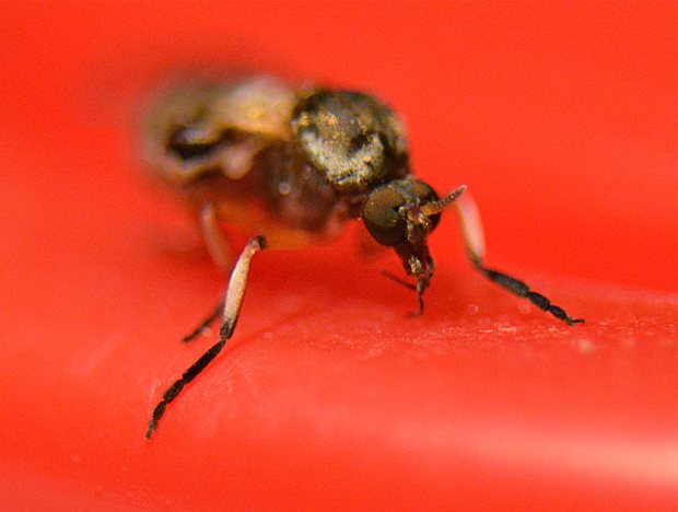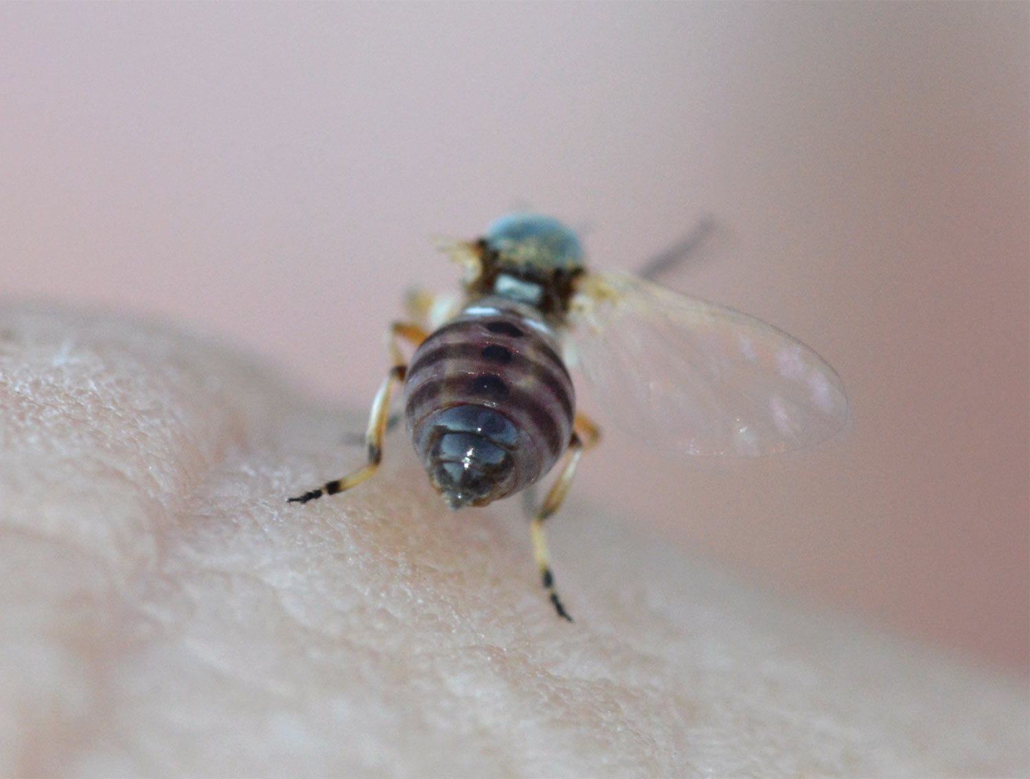 Esta tarde estaba observando hormigas cerca de donde vivo, en una zona donde acaban las edificaciones y empieza la montaña. En esta zona abunda el mosquito tigre (Aedes albopictus) y es donde pongo a prueba los productos que se comercializan contra los culícidos [1]. Andaba yo entretenido haciendo fotografías y mirándome las piernas porque ya empiezan a verse hembras de mosquito tigre. En una ocasión miro mi tobillo derecho y veo un insecto de pequeñas dimensiones allí abajo con la cabeza amorrada sobre mi piel. Me inclino y veo también que una gota gruesa de sangre empezaba a salir por una pequeña herida. Rápidamente cojo al insecto para ver de qué se trataba. Lo miro bien, le hago unas fotos y me temo lo peor. Una mosca negra del género Simulium, un simúlido. Es el primero que padezco en esta zona de Barcelona donde vivo.