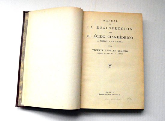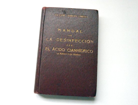 – Cebrián Gimeno, Vicente: Manual de la desinfección por el ácido cianhídrico (a bordo y en tierra, Talleres Voluntad, Madrid, ca 1930, 396 páginas, 14 x 21 cm.