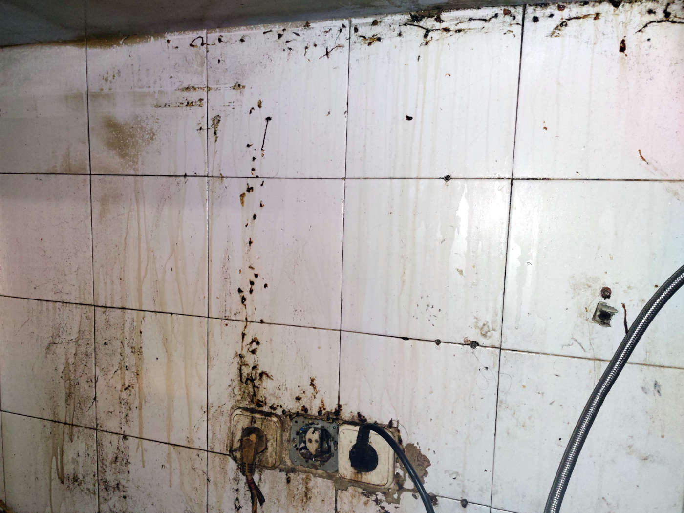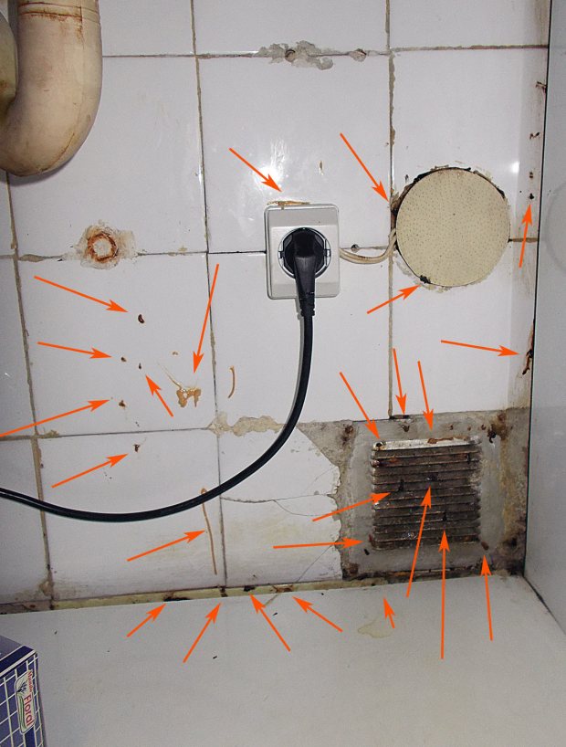En la imagen número 2, se puede ver la bisagra inferior de la misma puerta de armario. Mediante flechas rojas he indicado las diferentes gotas acumuladas. Estas son de diferentes colores, ya que han sido usados productos diferentes. En total he señalado 16 gotas. Son las más evidentes, porque además están las que no se ven. Yo, por ejemplo, si pongo una gota de gel en una bisagra, la suelo poner dentro de la misma bisagra o justo debajo para que no se vea. En la imagen número 3, se puede ver la parte posterior del mismo armario. Sobre la pared de azulejos los técnicos han ido poniendo el cebo de una manera un poco dispersa. He señalado las gotas de gel más evidentes.