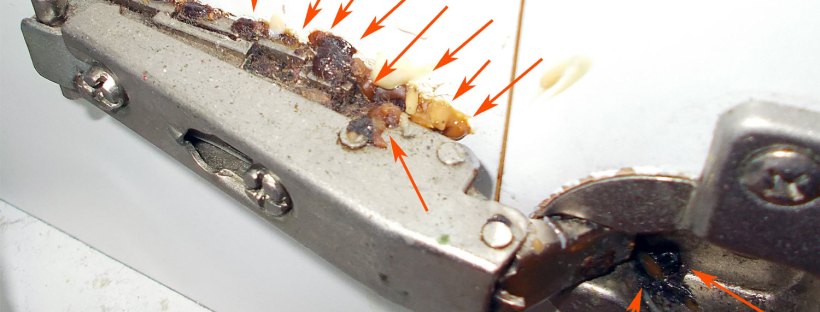 La bisagra de la imagen número 1 es la superior de una puerta de armario que queda bajo el fregadero de una cocina. Esta zona es un lugar ideal para la cucaracha germánica (Blattella germanica). La humedad es superior al resto de la cocina y la comida queda cerca. Las cucarachas suelen instalarse justo debajo de la encimera que bordea el fregadero. Desde allí, por las noches y con la calma que la acompaña, hacen sus incursiones sobre la encimera buscando restos de comida. Luego colonizan las bisagras del armario y, poco a poco, se van extendiendo por la cocina.