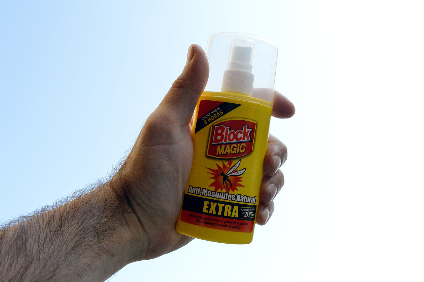 Por tanto, las sustancias químicas de uso tópico funcionan tan solo cuando están a poca distancia de la piel. Aspecto fundamental. Pero, ¿cuál es esta distancia? Por lo que he averiguado, y mientras alguien no me ilustre con otro dato, parece que el repelente actúa sobre el mosquito cuando este está a 4 centímetros [4]. Esto significa que, si vamos a usar un producto repelente, debemos aplicarlo sobre todas las zonas del cuerpo que queramos proteger. Si nos cubrimos tan solo una parte, quedará expuesta el resto a los mosquitos. En mi caso, cuando quiero tomar fotografías de mosquitos o mosca negra, o simplemente cazarlos, me impregno todo el cuerpo a excepción del brazo izquierdo. Y es aquí donde se posan.