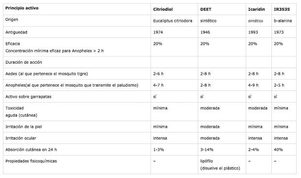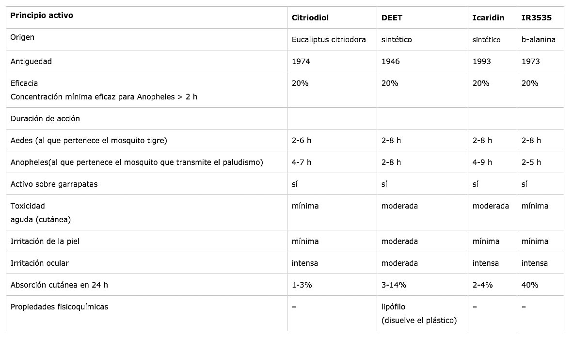 Las sustancias repelentes más utilizadas en el mercado español son 4. Por número de productos comercializados el orden sería:  IR3535, DEET, citriodiol e icaridina. En la siguiente tabla, publicada por el Centre d’Informació de Medicaments de Catalunya [7], se puede ver sus principales características y diferencias: