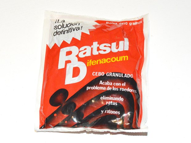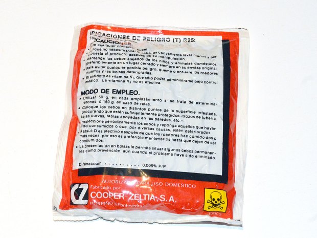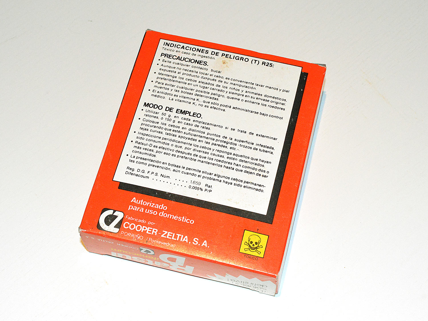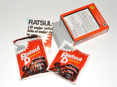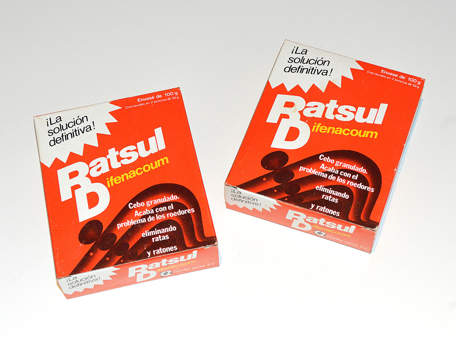 He encontrado un par de bonitas y viejas cajas del raticida RATSUL D con difenacoum, materia activa anticoagulante de segunda generación. Creo que son de cuando fue lanzado hacia 1985 por Cooper-Zeltia SA, empresa estuvo activa entre 1964 y 1991 cuando pasó a denominarse con el nombre actual de Zelnova SA [1].