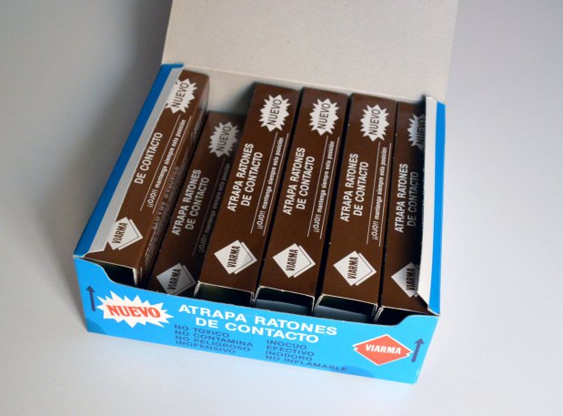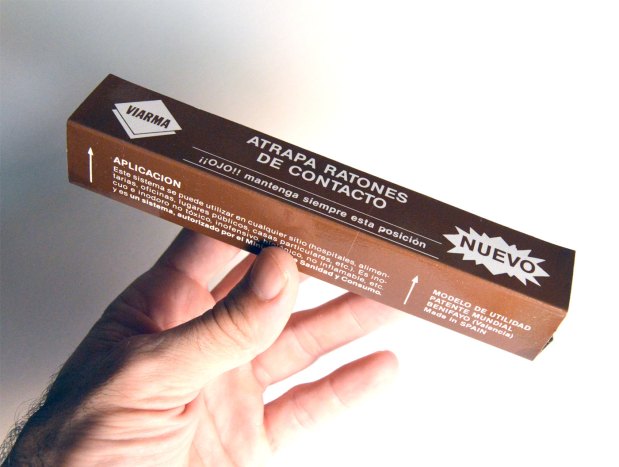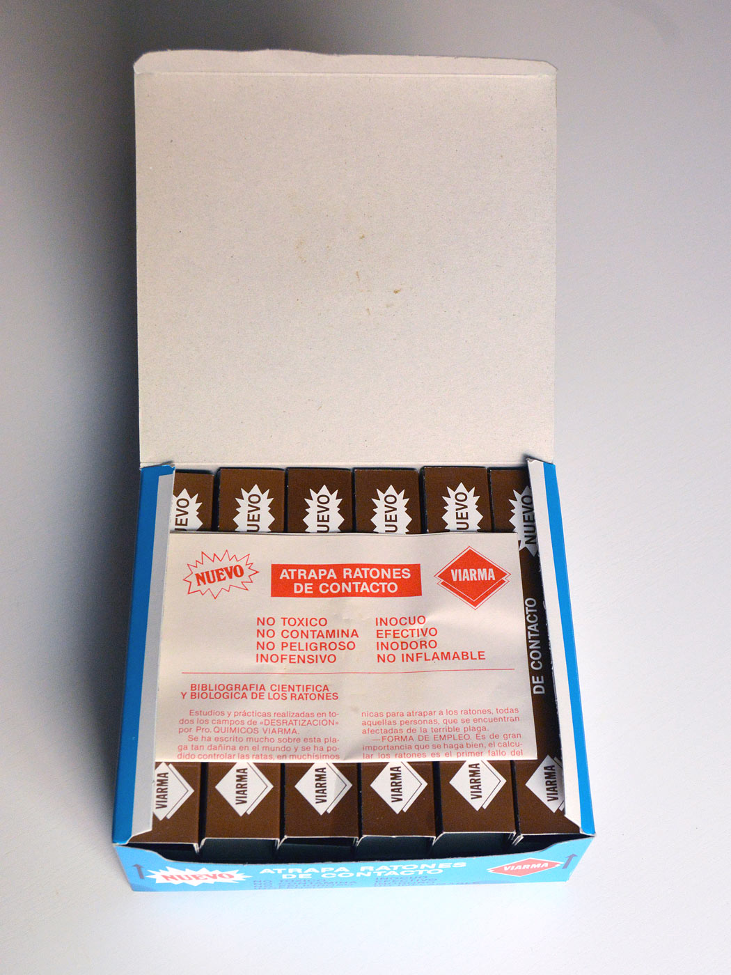 He encontrado una caja de un producto que decía ser revolucionario. En el lateral de la caja se lee «modelo de utilidad, patente mundial.» Fue comercializado por José Vicente Arcis Marí (VIARMA) de Benifayó. Hace cosa de un año dediqué una entrada a otro producto de esta empresa, a la Cola raticida e insecticida Cerrat [1]. No sé bien bien cuándo el producto Atrapa ratones de contacto se comercializó ni durante cuánto tiempo. Me da que fue a mediados de la década de 1990. Si alguien dispone de información, le estaré agradecido la comparta.