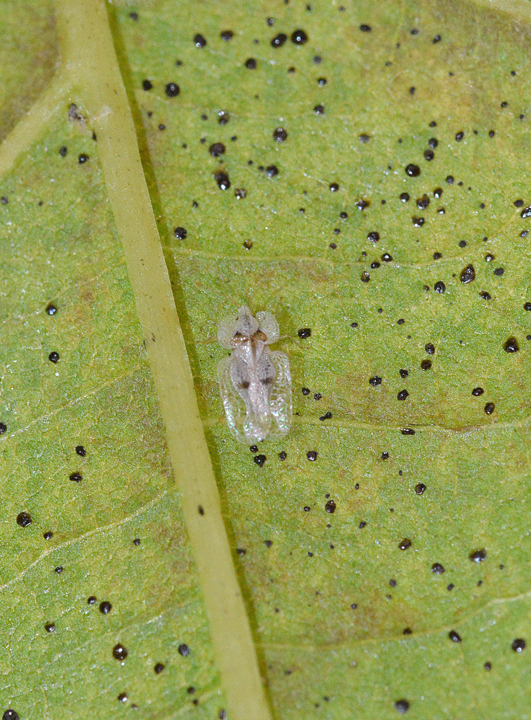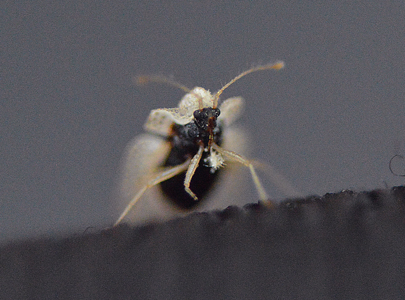 He de apuntar que esta chinche me parece de gran belleza. Está recubierta por una cutícula blanca que parece hecha de encaje de bolillos. Además no es lisa, sino que tiene relieve. Sobre la cabeza tiene una especie de cofia que me recuerda a la que llevaban antaño algunas órdenes de monjas. Pero si volteamos una de estas chinches, veremos que, en verdad, el color de su cuerpo es oscuro, tanto como el color del líquido que excreta (figura 9). Tiene un tamaño de unos 4 milímetros de longitud [3].