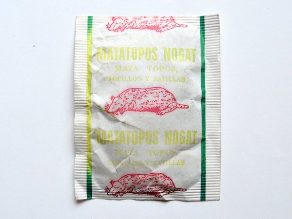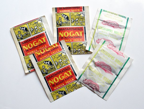 Han caído en mis manos tres sobres de Matarratas Nogat. Y junto con estos, llegaron un par de sobres de Matatopos Nogat. Una maravilla. Estéticamente los sobres de raticida son de gran belleza. Como ya he comentado en más de una ocasión, Nogat es una marca que continúa en activo. Y es la decana de todas las marcas de raticida que se venden en España, ya que inició su travesía por los mares del mercado en 1923 [1]. Hasta la década de 1990 fue un producto formulado con fosfuro de zinc, sustancia activa que causa intoxicación aguda. Pero a partir de esta década cambió el fósforo por el anticoagulante bromadiolona.
