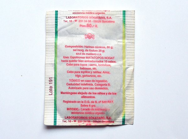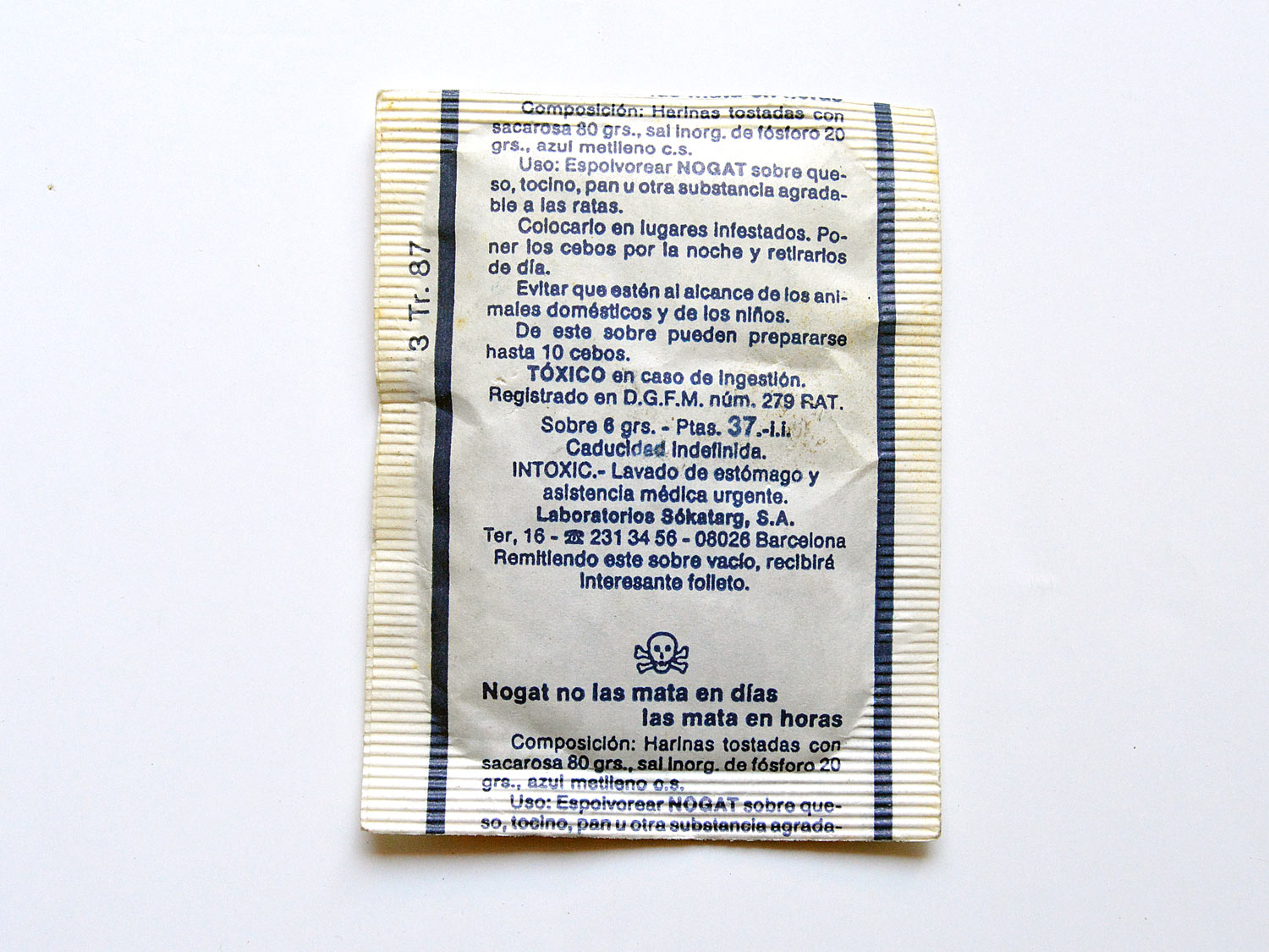 Vayamos al producto en sí. Los sobres miden 8’5 centímetros de largo por 6’5 de ancho. Cada uno pesa cerca de 8 gramos. Su contenido es de 6 gramos. En el caso del Matarratas Nogat contiene harinas tostadas, sal inorgánica de fósforo y azul de metileno. Interesante este último producto, que servía para dar color vistoso al raticida. Sabemos que el color azul no es nada habitual en la comida. De hecho, si vemos algo azul, sospechamos de que no esté en buen estado. Para su uso, se espolvoreaba el producto sobre los alimentos con los que se iba a cebar a las ratas. Estos sobres se vendían a 37 pesetas cada uno. El número de registro del Ministerio de Sanidad era el 279-RAT.