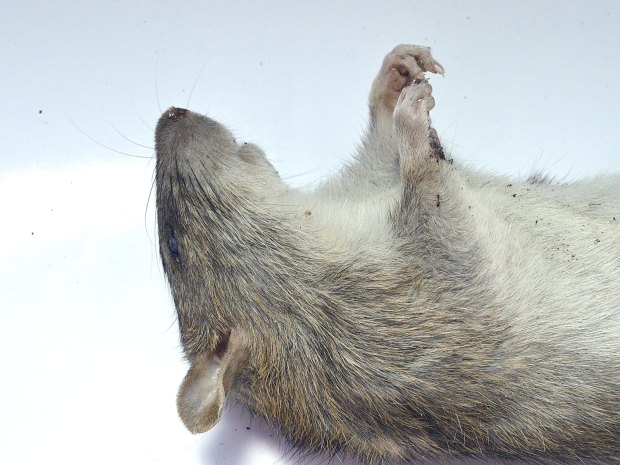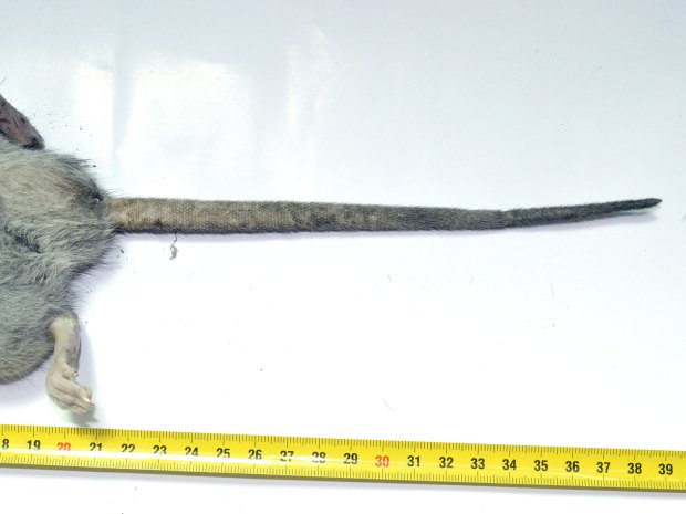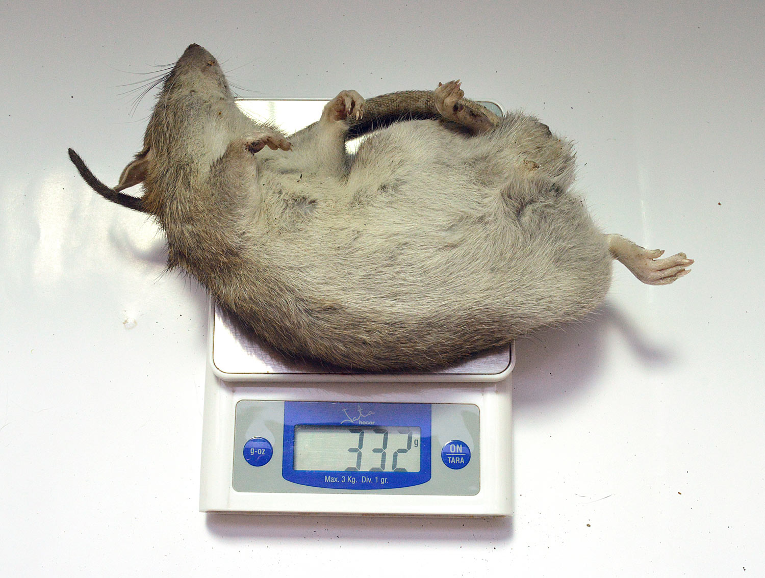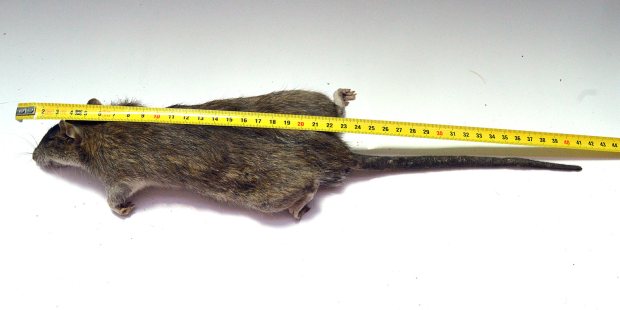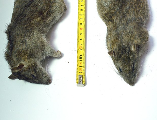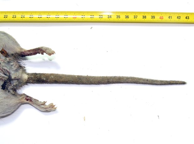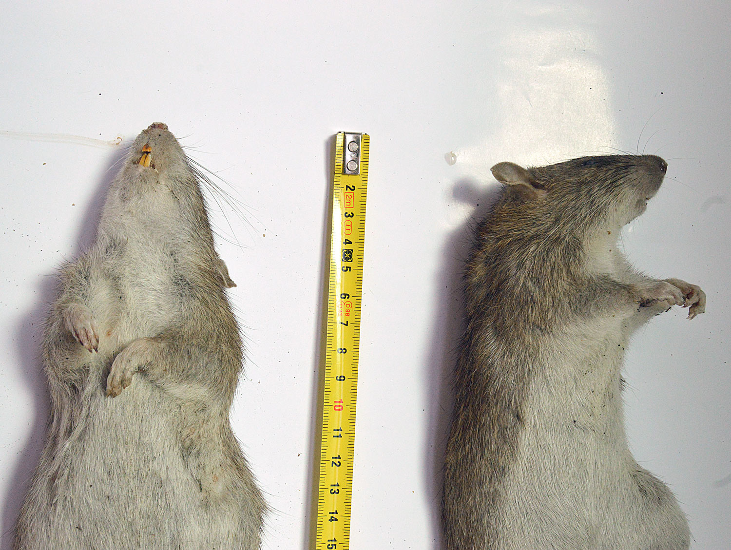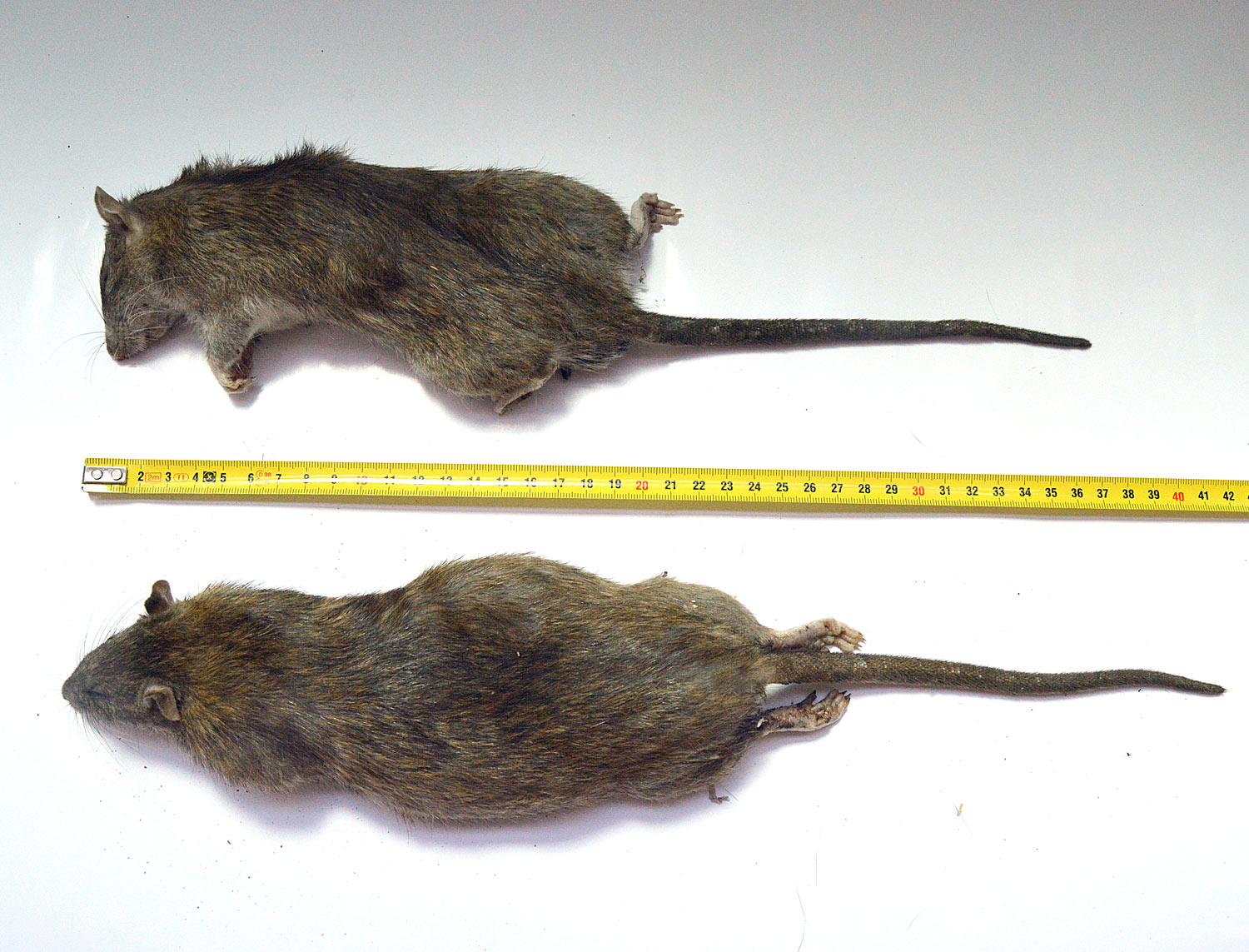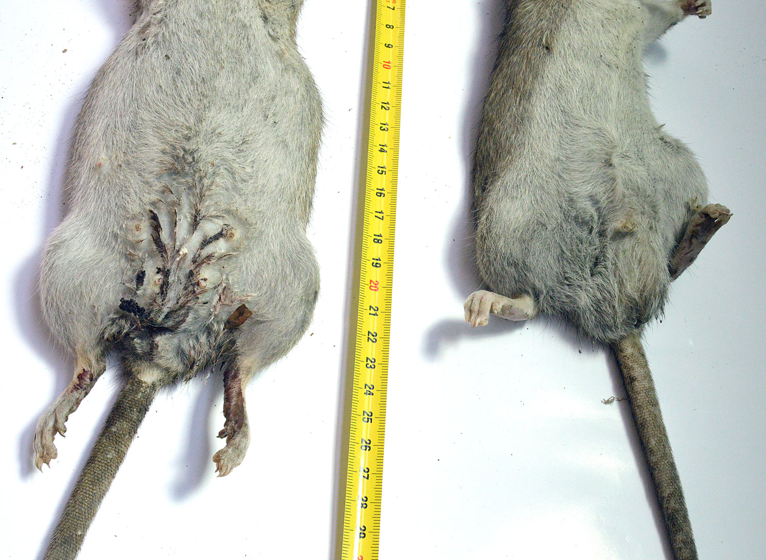 El pasado jueves encontré muertas dos ratas de alcantarilla (Rattus norvegicus). Dio la casualidad de que eran macho y hembra. Debían llevar menos de un día muertas. Aproveché para llevármelas y tomar unas fotos. También las medí y las pesé. Son dos ejemplares adultos que entran dentro de la media de lo que suele ser una rata de alcantarilla. Si nos fijamos en la imagen número 1, el macho se puede ver en la parte superior. Tiene un tamaño y peso menor que el de la hembra, situada en la parte inferior. El macho mide unos 41 centímetros de cabeza a cola y pesa unos 332 gramos. La hembra mide unos 43 centímetros y pesa unos 376 gramos.