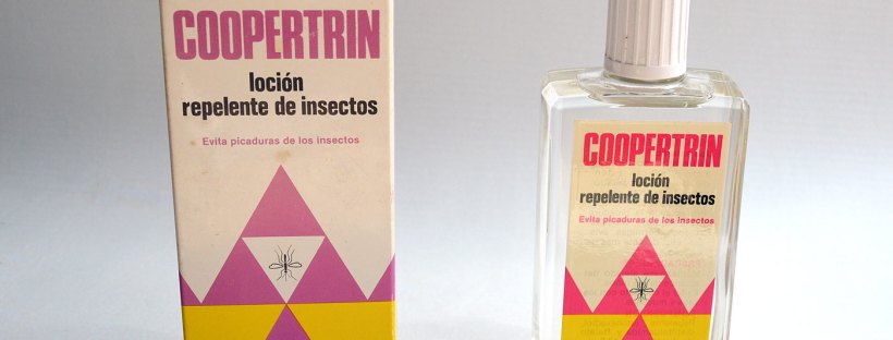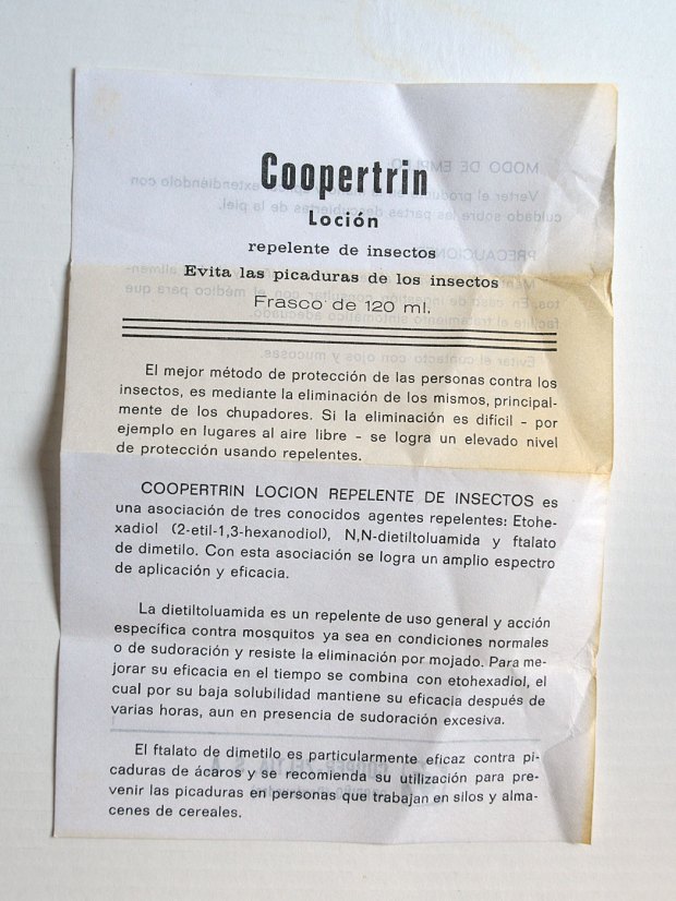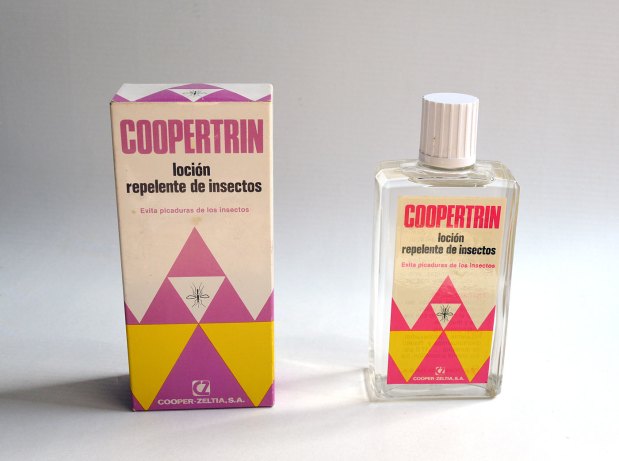 He encontrado un producto descatalogado interesante. Se trata de una loción repelente de insectos que comercializó Cooper-Zeltia SA bajo el nombre de Coopertrin. No sabría decir entre qué años estuvo en el mercado. He buscado en hemerotecas y no he encontrado nada sobre este producto. Si tuviera que situar este producto, quizás diría que fue comercializado entre 1975 y 1980. Un detalle a tener en cuenta es que, en la parte inferior de uno de los laterales de la caja (figura 3), aparecen puntos suspensivos en el lugar donde debiera figurar el número de inscripción en el registro de la Dirección General de Farmacia. No sé la razón. Quizás el producto fue comercializado sin disponer todavía de este número.