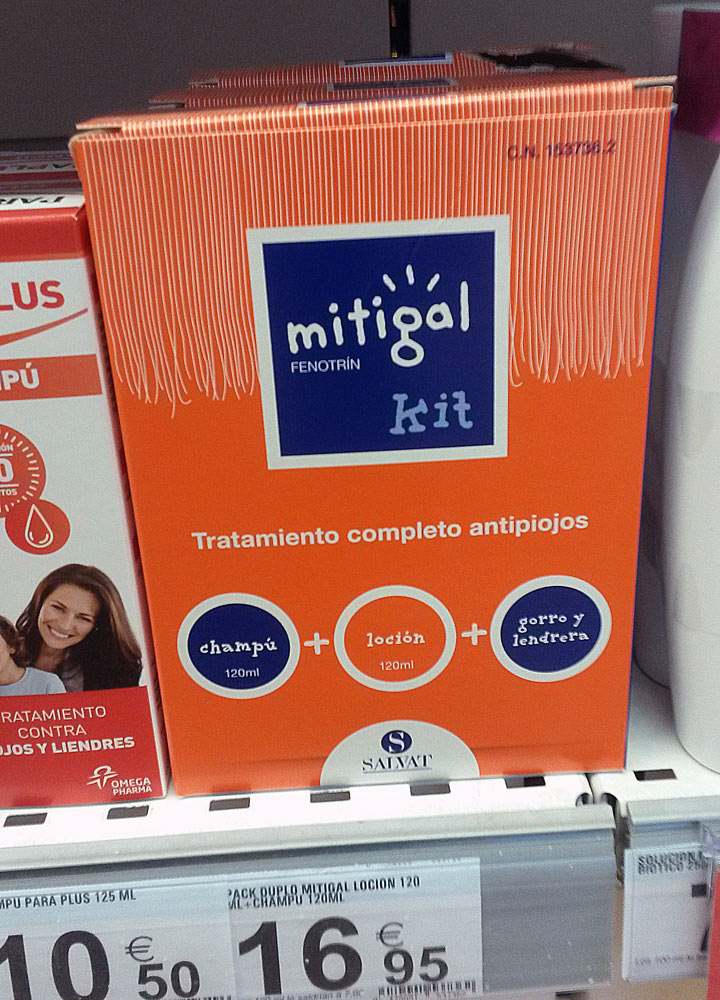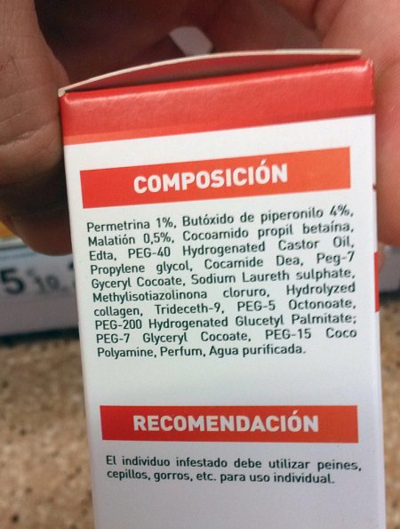 Llegados a este punto, considero que es mejor usar productos que no lleven insecticidas. Y, si de mí dependiera, el malatión no se debería utilizar como pediculicida, pues se trata de un organofosforado. Es cierto que, comparado con otros organofosforados, es menos tóxico y tiene menos persistencia. Pero, repito, se trata de un organofosforado. Y además, va a ser aplicado sobre niños. Creo que ya existen otras alternativas con plaguicidas de la familia piretroide como la permetrina que deberían hacer que se retirara para este uso. Claro que en este país las cosas van lentas. Y los responsables del Ministerio no suelen estar muy bien enterados y/o asesorados. Baste mencionar que hasta hace unos años en el mercado había un pediculicida con lindano. Y para acabar, comentar que en la imagen número 1 se puede ver un producto con malatión. Y en la imagen número 2 se puede ver un producto que, además de malatión, contiene permetrina. ¡Vaya receta!