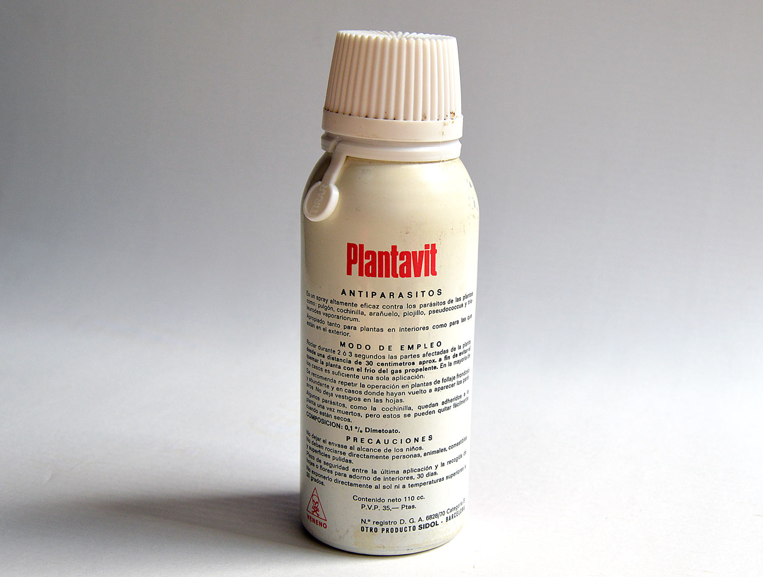 Como se puede ver en las imágenes, el antiparásitos es un bote de pequeñas dimensiones pensado más bien para un solo uso. Mide 12’5 centímetros de altura por 4’5 de diámetro. Su composición es dimetoato al 0’1%, insecticida de la familia de los organofosforados que ha tenido un gran uso en sanidad vegetal. Fue desarrollado por American Cyanamid y comercializado a partir de 1955. Como se puede ver, el bote no tiene el código de barras. Así que imagino que será de principios de la década de 1980. En la terraza tenía una planta con pulgón. Probé el producto y rocié las hojas. Después de 30 años, Plantavit ejerció todo su poder. Y también dejó su característico olor.