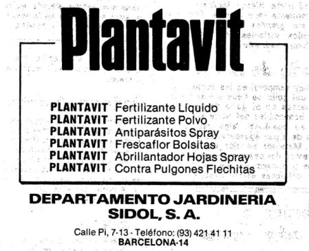 La empresa responsable de esta marca fue Sidol SA. Creo que en estos momentos no está en funcionamiento. Fue fundada en la década de 1920 en la calle del Pi número 7 de Barcelona como fábrica de productos de limpieza. Tuvo muchas marcas en su haber, pero las más importantes fueron dos, el Limpiacristales Sidol y la Crema Lodix para el calzado. No sé cuándo esta empresa amplió su catálogo con productos para plantas. El anuncio más antiguo que he encontrado de Plantavit fue publicado en La Vanguardia el 14 de mayo de 1981 (figura 4). El nombre con el que fue bautizada la gama de productos fue bien elegido. En sí mismo ya indicaba su relación con el uso y, además, significaba en latín «él plantó» [1].
