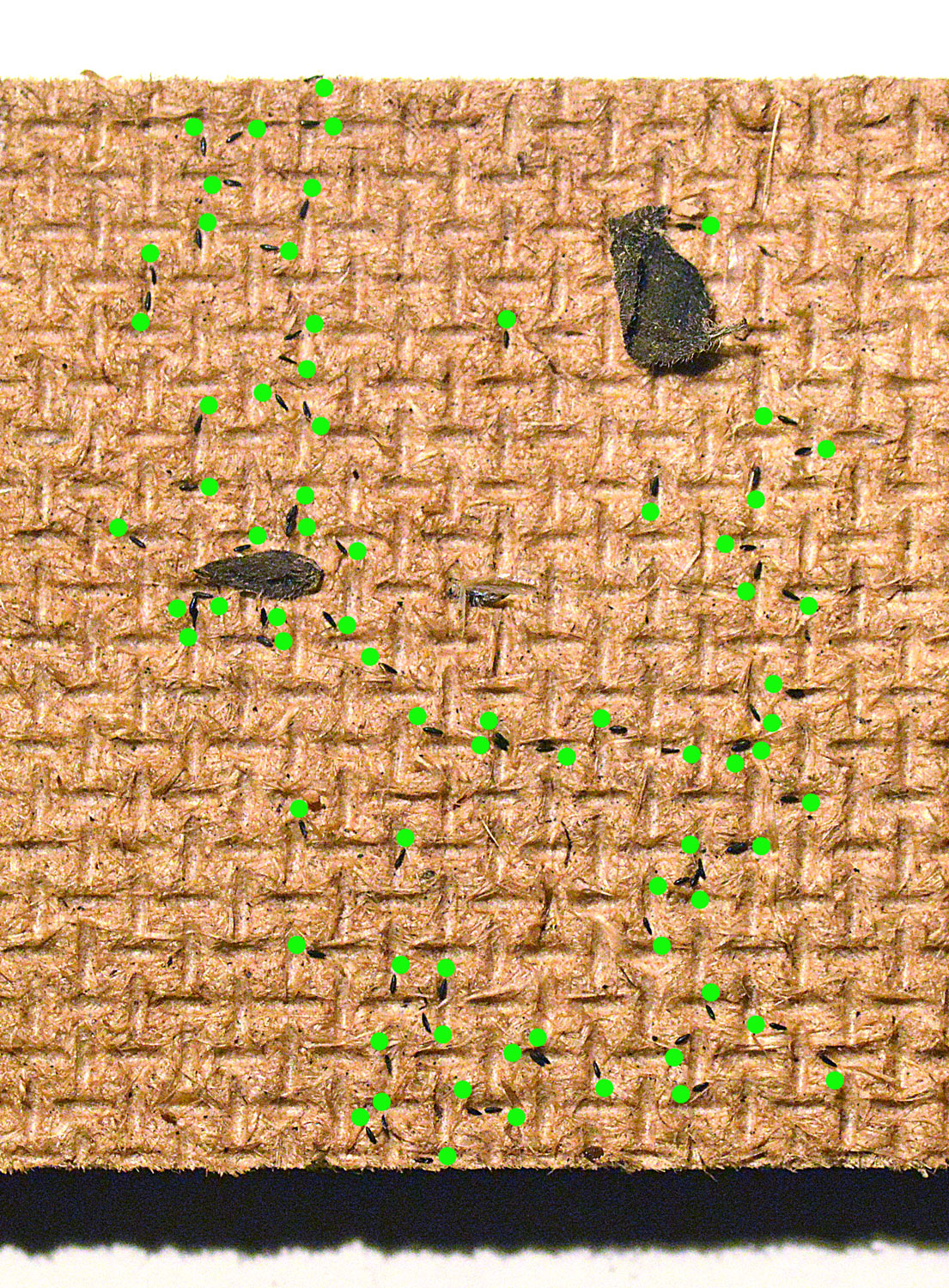Pasaron 6 días. Recogí las trampas de oviposición el jueves 6 de agosto. En casa observé si había huevos de mosquito tigre. En la que estaba más alejada del punto crítico, no encontré casi huevos, 16 en total. Pero en la que estaba en ese punto crítico, había bastantes. En la imagen número 3, se puede ver la tablilla. He marcado la zona en donde están adheridos los huevos. Son de color negro. Interesante este aspecto porque ayuda a entender por qué buscan las hembras la oscuridad. En total contabilicé 86 huevos. 73 de estos estaban adheridos sobre la superficie rugosa de la tablilla (figura 4). Y 13 estaban en los laterales.