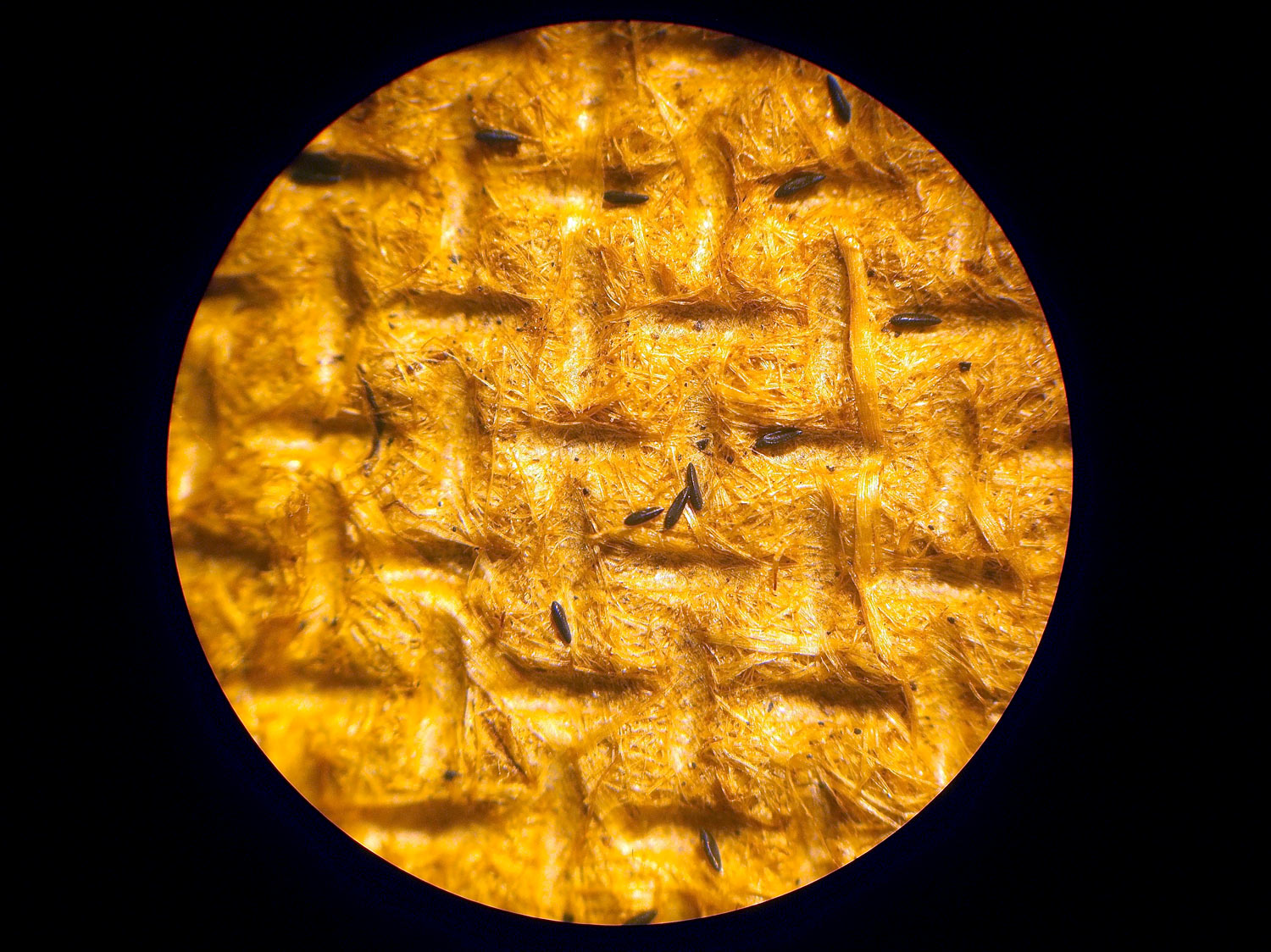 Luego, tras tomar las fotografías, los introduje en agua. Al cabo de una hora, ya había salido la primera larva. Maravilloso. Era diminuta y blanca. Pude ver cómo otras larvas iban saliendo de los huevos. Luego introduje las larvas en un frasco en el que tengo una muestra de mosquito común (Culex pipiens). Es interesante la comparación entre ambas especies, porque mientras el mosquito común puede criar en una gran variedad de aguas y aguanta muy bien la contaminación, el tigre tiene otros requerimientos. Sin embargo, si uno recoge una muestra de larvas mosquito común y otra de mosquito tigre, observará como las larvas de tigre aguantan días y días. Y los de común, por lo general, aguantan menos.