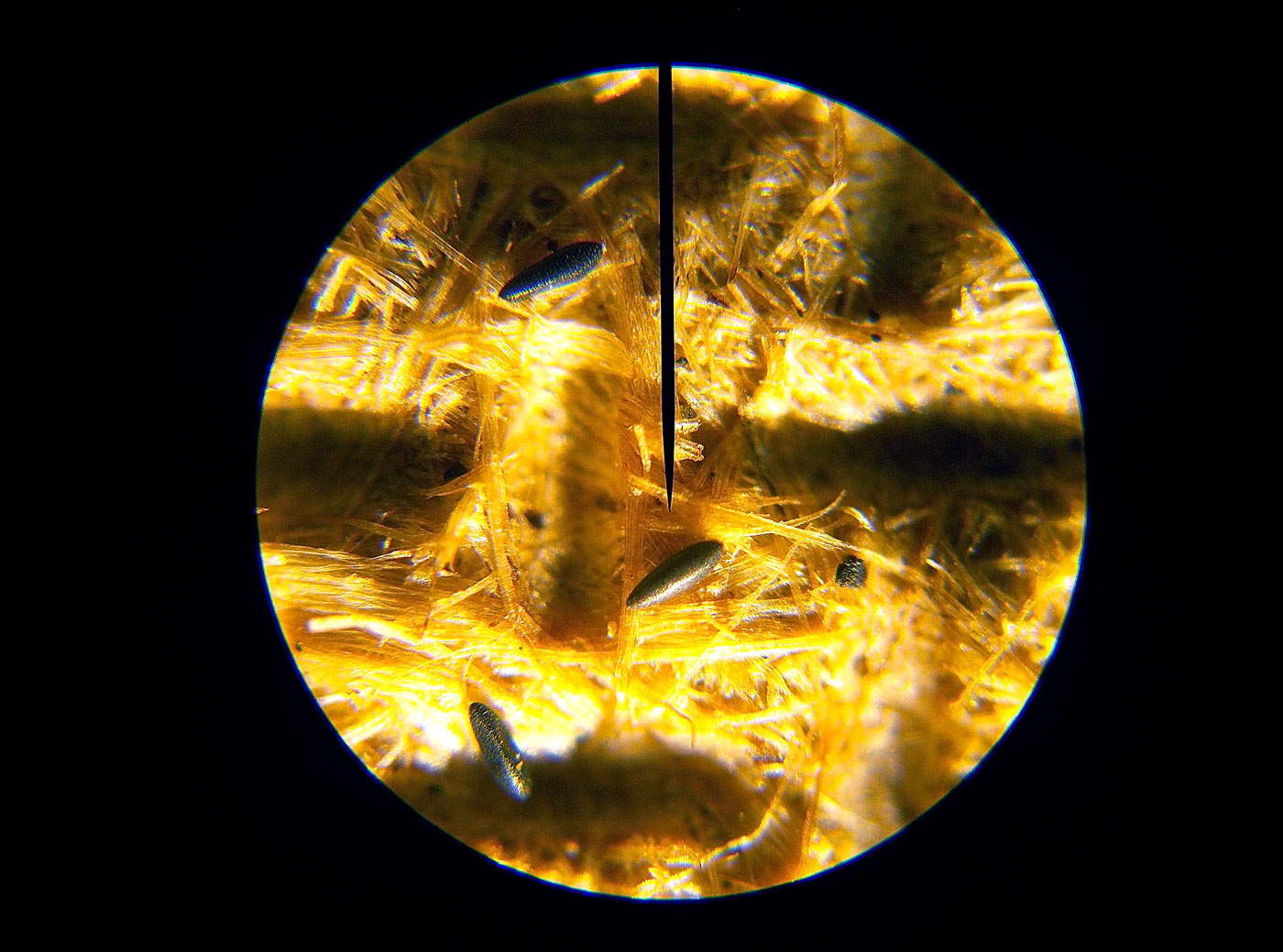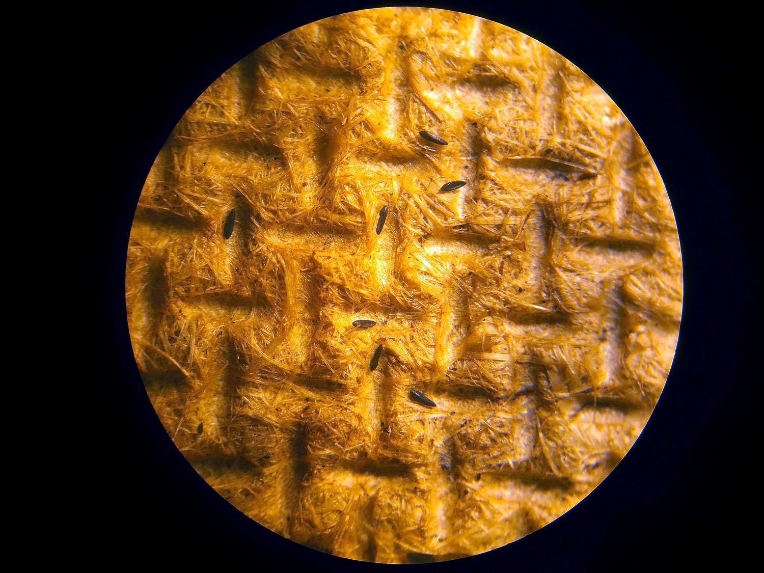 En las imágenes 5, 6 y 7, se pueden ver los huevos a través de la lupa binocular y el microscopio. No son imágenes muy nítidas, pero servirán para hacerse una idea de cómo son los huevos. Pero para hacerse una idea de su tamaño, está la imagen número 8, en donde se pueden ver sobre papel milimetrado. Me entretuve a despegar algunos huevos. Son delicados.