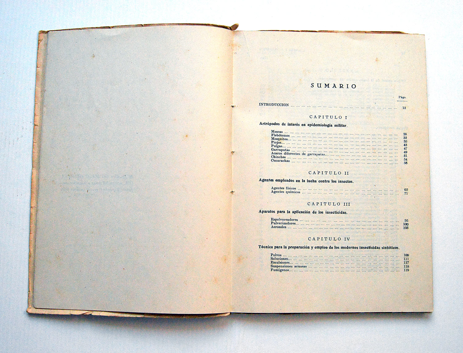 Llevaba un par de años detrás de este libro. Lo encontré citado en la bibliografía de otro libro y pensé que valía la pena buscarlo. En este blog he dedicado espacio a un par de manuales publicados por el Ejército español. Primero dediqué una entrada al ‘Manual de Desinfección, Desinsectación y Desratización’ de 1964 [1]. Y luego, otro a las ‘Orientaciones: Material Veterinario de Desinfección, Desinsectación y Desratización (DDD)’ de 1994. Ambos textos los considero muy importantes por tratarse de eso, de manuales, ya que se explica y detalla cómo realizar las aplicaciones de control de plagas. Permiten un pequeño viaje al pasado y hacerse una idea de la evolución de este oficio. Hay que hacer constar que, fuera de estos manuales militares, no he encontrado ningún texto de antaño que se les asemeje en calidad y cantidad de información. Esto parece lógico porque en el pasado esta institución no tuvo problemas de personal ni de presupuesto, ya que era la base que sostenía la dictadura.