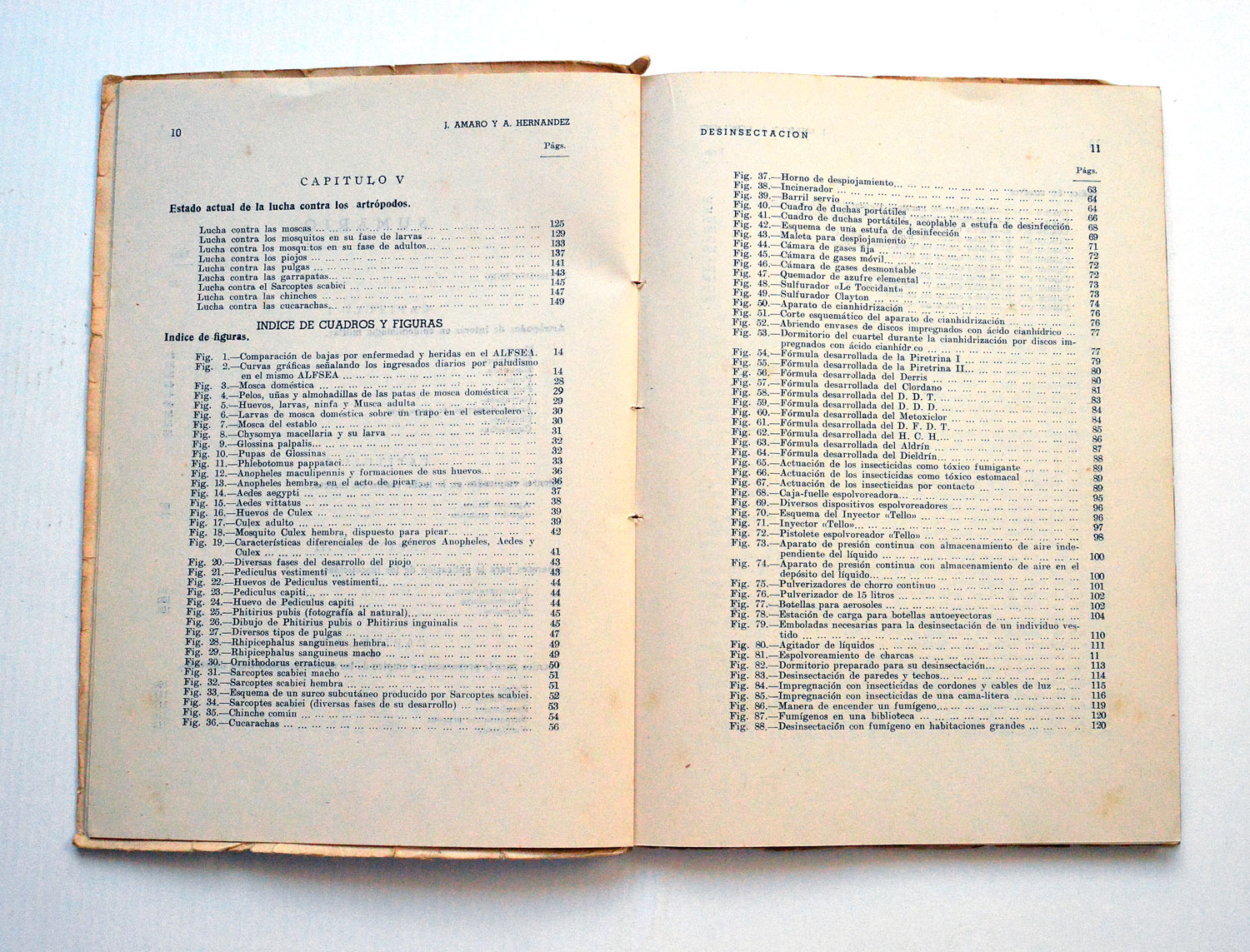 Busqué el libro sin dar con él, hasta que hace un par de meses apareció a la venta en una página de internet. No dudé en comprarlo. Y ha valido la pena. El texto es muy completo e interesante. Creo que es el mejor manual que he encontrado sobre el tema. La primera parte está dedicada a describir los animales que hay que combatir. Luego se describen los agentes empleados, los aparatos y los preparados insecticidas. El último capítulo se dedica a dar cuenta de las diferentes maneras de tratar a cada plaga. Para hacerse una idea del contenido del manual, en las imágenes 2 y 3 se puede ver el índice.