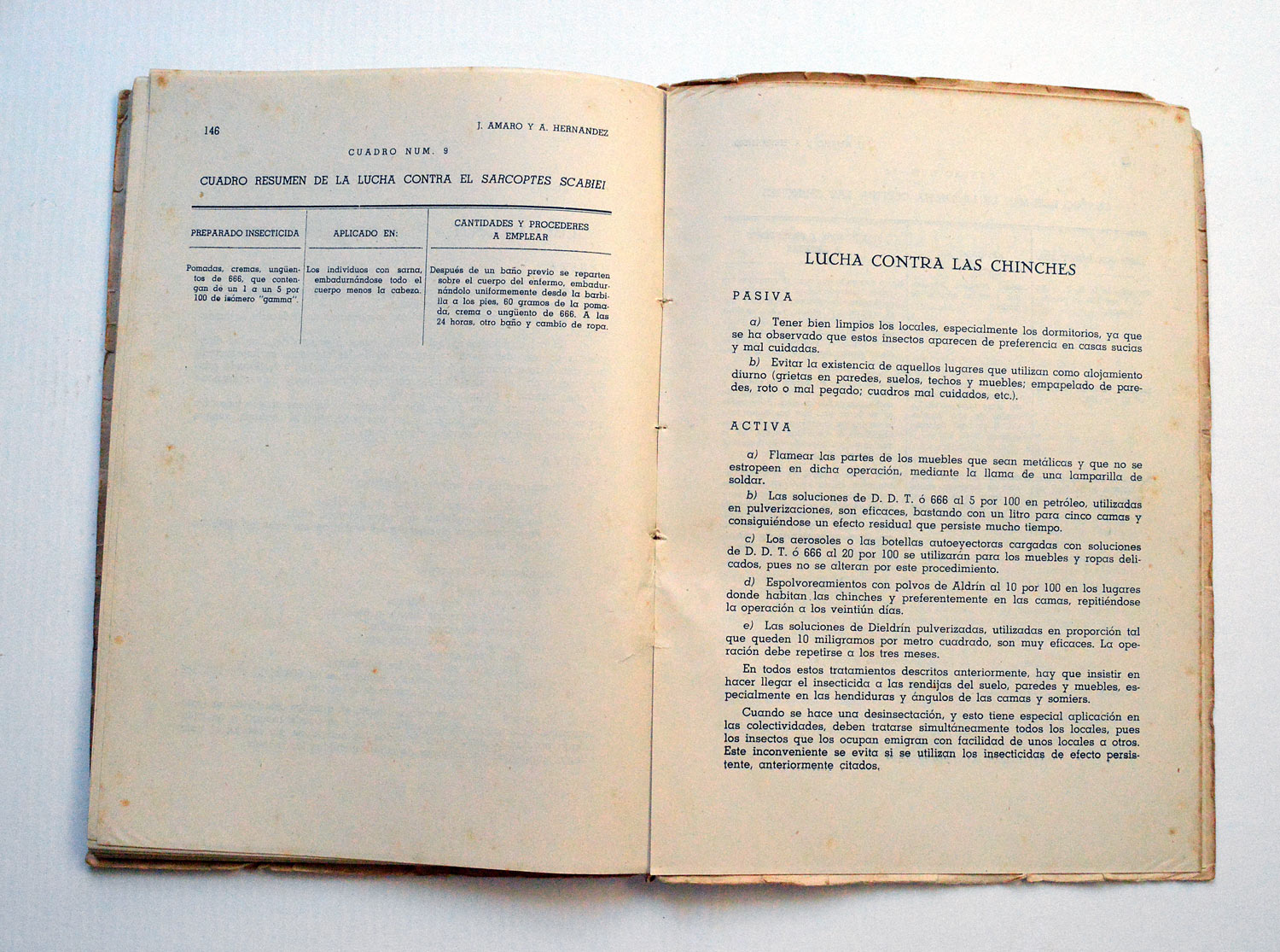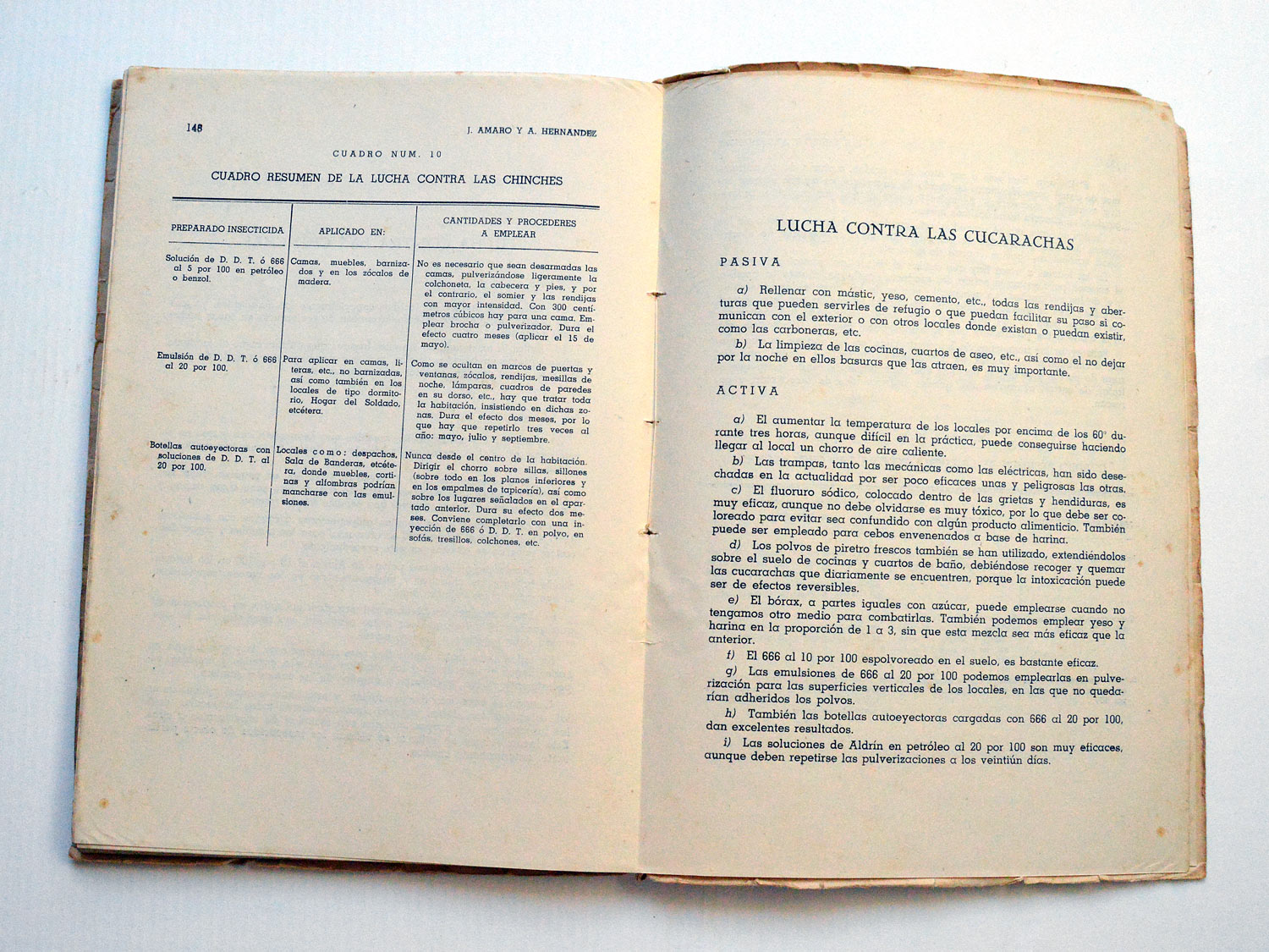 El capítulo final está dedicado a describir los diferentes tratamientos destinadas a combatir los artrópodos. En las imágenes 5, 6 y 7, se pueden leer los apartados dedicados al control de chinches y al de cucarachas. Es interesante leer el cuadro resumen de cada apartado. En la imagen número 6, correspondiente a la página 148, está el cuadro de la lucha contra las chinches. Se puede ver para cada preparado insecticida cómo debe ser aplicado e, importante, cada cuanto tiempo. Las soluciones de DDT o 666 (otro nombre que recibía el HCH en la época) en derivados del petróleo tenían una persistencia de 4 meses. Se recomendaba una aplicación anual para el 15 de mayo. Para las emulsiones con DDT o HCH el efecto era tan solo de dos meses. Y si con estas materias activas este manual da tan menguados tiempos de persistencia, ¿qué diremos hoy en día con los insecticidas que tenemos?