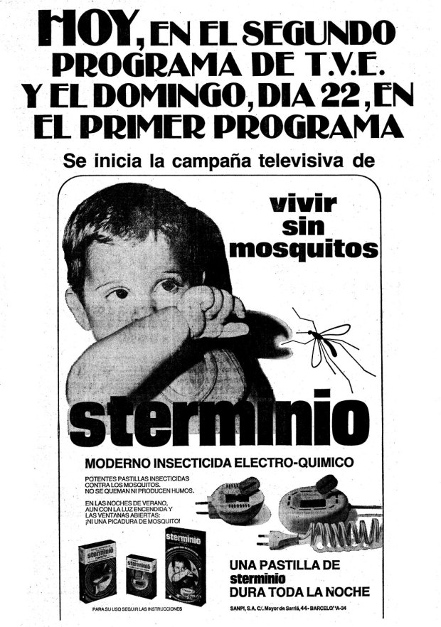 En el formato moderno como conocemos hoy los evaporadores, una de los primeros sistemas en aparecer en el mercado español fue Sterminio. Fue comercializado por la Sociedad Anónima de Nuevos Productos Comerciales (SANPI), con sede en la ctra Nacional II, km 606, de Pallejà (Barcelona). Parece que los aparatos que puso esta compañía en el mercado fueron de patente propia. En internet se puede encontrar copia de las diferentes patentes registradas [5]. Estos evaporadores no parecen más que modificaciones de otros ya comercializados en otros países. Por lo que he encontrado, Sterminio fue lanzado en 1980. El primer anuncio que he encontrado fue publicado en junio de 1980 y a toda página en La Vanguardia (figura 6). Tal y como se puede leer, empezaron fuertes por medio de una campaña de televisión y usando la imagen de un niño. Sterminio llegaba para proteger a los más vulnerables. Después de este anuncio, tan solo he encontrado otro de 1982 (figura 7). Se publicita como moderno insecticida eléctrico. Y junto a Sterminio se menciona Moskiller contra moscas, otro producto de la misma casa. El formulado era como el de Sterminio, pero las pastillas estaban impregnadas de mayor cantidad de insecticida.