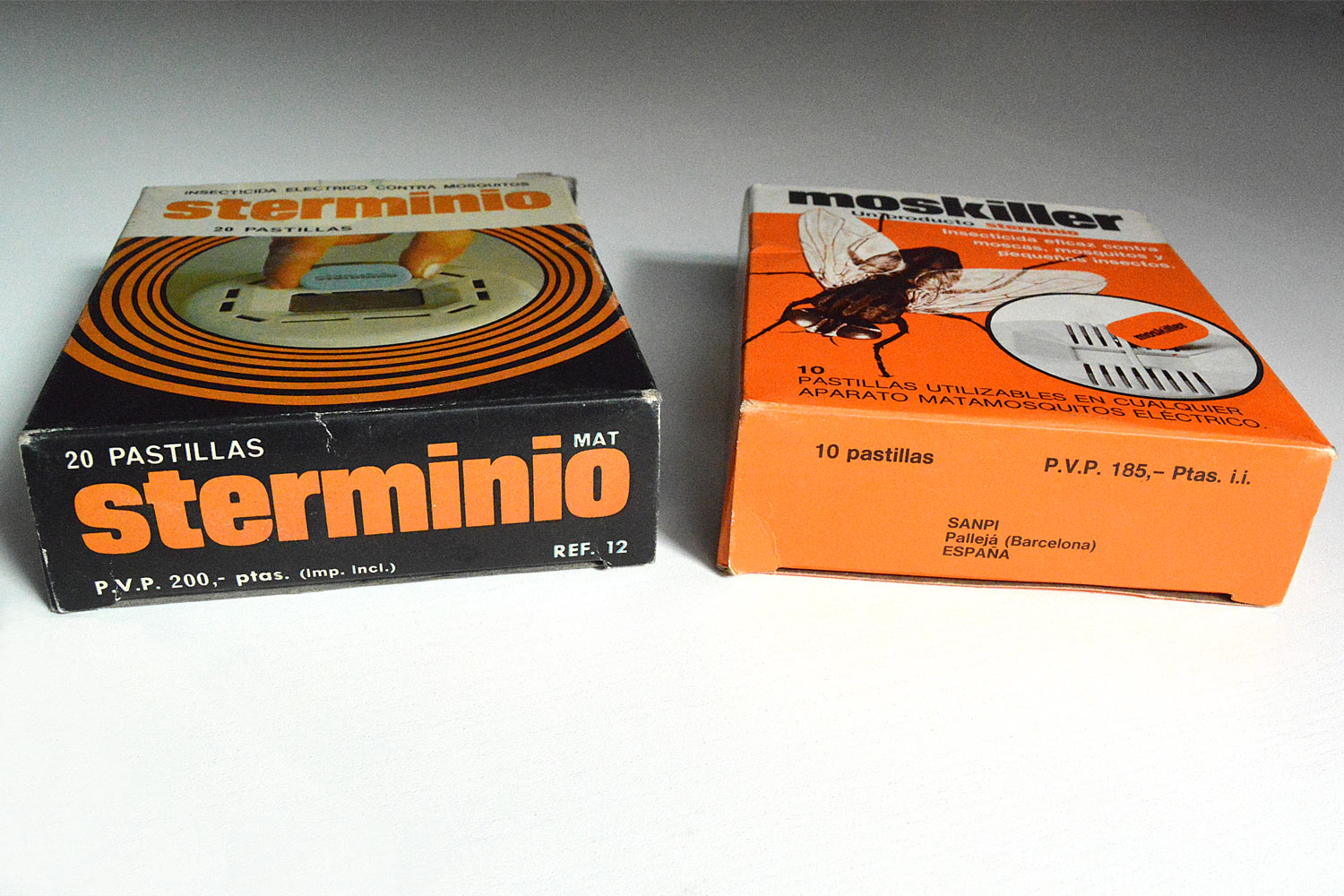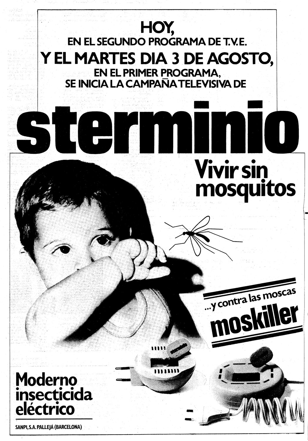 En el formato moderno como conocemos hoy los evaporadores, una de los primeros sistemas en aparecer en el mercado español fue Sterminio. Fue comercializado por la Sociedad Anónima de Nuevos Productos Comerciales (SANPI), con sede en la ctra Nacional II, km 606, de Pallejà (Barcelona). Parece que los aparatos que puso esta compañía en el mercado fueron de patente propia. En internet se puede encontrar copia de las diferentes patentes registradas [5]. Estos evaporadores no parecen más que modificaciones de otros ya comercializados en otros países. Por lo que he encontrado, Sterminio fue lanzado en 1980. El primer anuncio que he encontrado fue publicado en junio de 1980 y a toda página en La Vanguardia (figura 6). Tal y como se puede leer, empezaron fuertes por medio de una campaña de televisión y usando la imagen de un niño. Sterminio llegaba para proteger a los más vulnerables. Después de este anuncio, tan solo he encontrado otro de 1982 (figura 7). Se publicita como moderno insecticida eléctrico. Y junto a Sterminio se menciona Moskiller contra moscas, otro producto de la misma casa. El formulado era como el de Sterminio, pero las pastillas estaban impregnadas de mayor cantidad de insecticida.