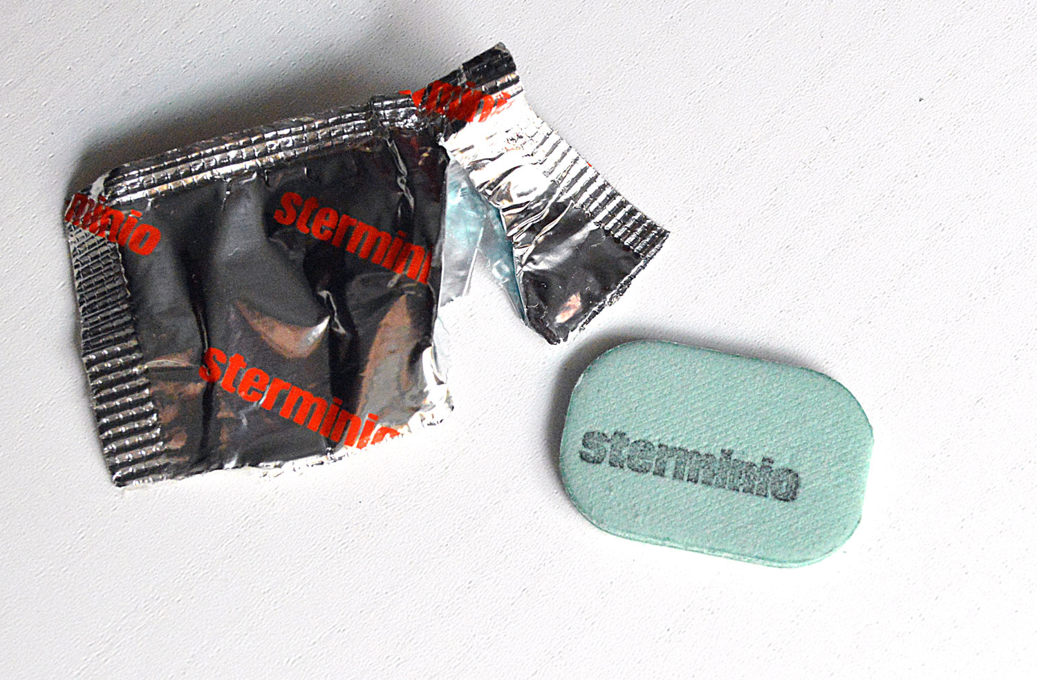 En la imagen número 2, se puede ver el reverso de una caja de Sterminio y de otra de Moskiller. Sterminio fue registrado con el número 992-INS de la DGOF. Y su composición era bioaletrina (40 mg), butóxido de piperonilo (30 mg), extracto de piretro (10 mg), BHT (20 mg), perfume, pigmento y soporte. Moskiller fue registrado con el número 1100-INS y contenía bioaletrina (80 mg), butóxido de piperonilo (30 mg), BHT (20 mg), perfume, pigmento y soporte. Interesante es que en ambas composiciones aparecen las iniciales BHT, que seguramente sean las del  butil hidroxitolueno (E-321). Se trata de un aditivo alimentario que previene la oxidación de aceites esenciales. Lo que no sé es si estaba presente para evitar que se estropeara el perfume que llevaban las pastillas o tenía otra función.
