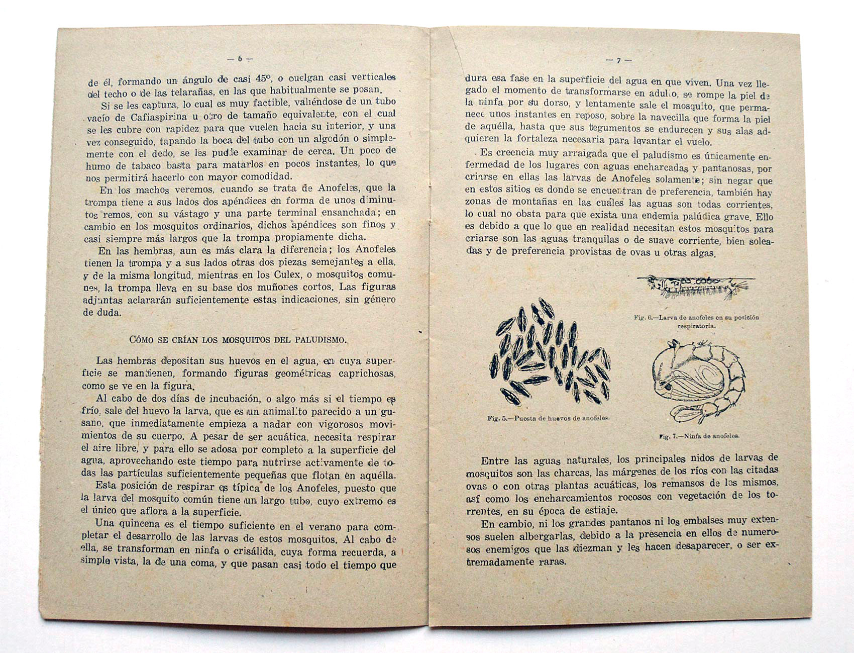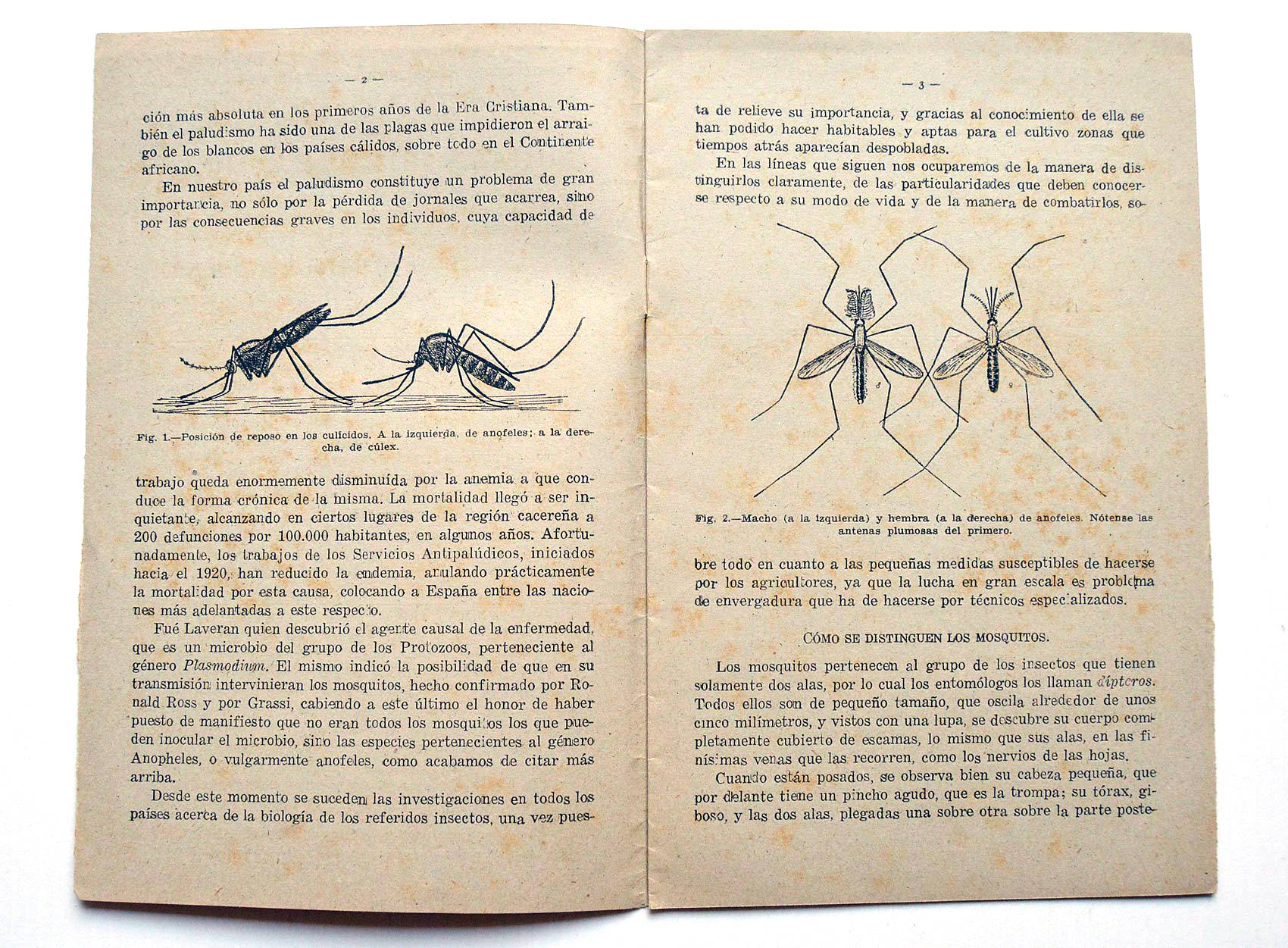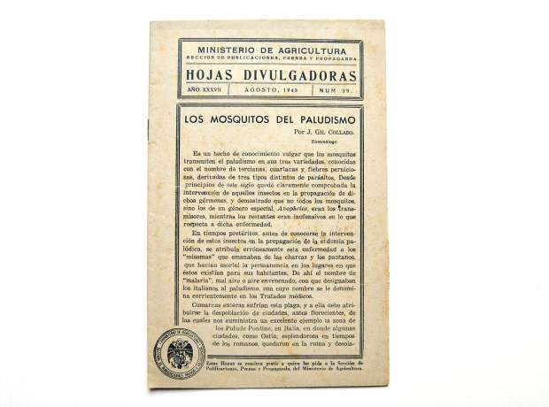 He dedicado espacio en este blog a hablar de Juan Gil Collado (1901-1986), ya sea a partir de libros suyos que he adquirido o a partir de su implicación en la lucha antipalúdica llevada en España en el pasado siglo. Este entomólogo jugó un papel importante en la erradicación de esta enfermedad gracias a sus estudios sobre la biología de los mosquitos del género Anopheles. Y, en concreto, sobre el principal vector, el mosquito Anopheles maculipennis atroparvus. Ejemplo de ello es la obrita ‘Los moquitos del paludismo’ que fue publicada en 1945 en las ‘Hojas Divulgadoras’ del Ministerio de Agricultura. En sus 16 páginas se presenta un resumen del estado de la cuestión. No solo sobre la biología del mosquito, sino sobre su combate.