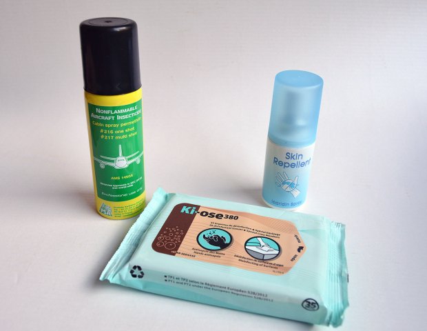 Según parece, las toallitas desinfectantes forman parte de la dotación fija de los vuelos a cualquier destino. En cambio, el bote de insecticida y el de repelente se incluyen en vuelos con destino a zonas donde están presentes enfermedades transmitidas por mosquitos. Aunque existen países, como por ejemplo Australia, en donde son aplicados en todos los vuelos que llegan del extranjero.