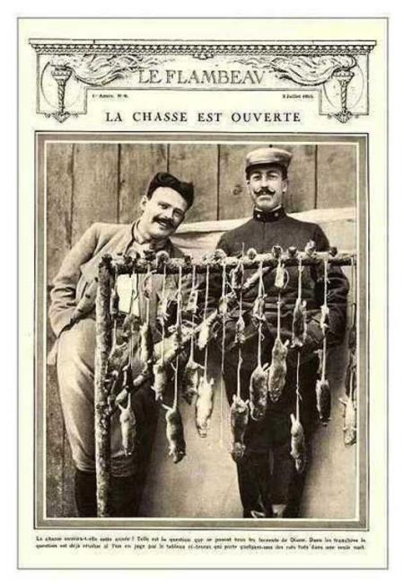 Otra imagen interesante, y un poco más divertida, es la número 3. Se pueden ver todas las ratas a las que un terrier dio caza en 15 minutos. Los perros fueron muy apreciados en las trincheras por este motivo. Y también tiene su punto divertido la imagen número 4 que pertenece a la revista francesa ‘Le Flambeau’ y cuyo titular dice «la veda está abierta».
