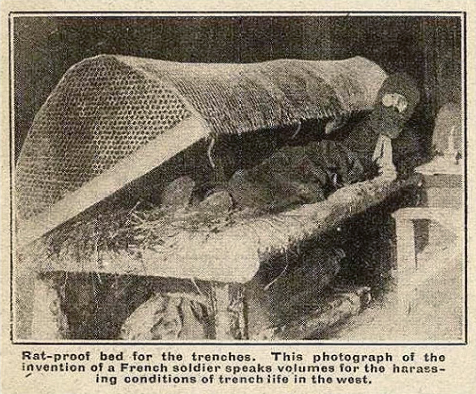 En internet, se puede encontrar información sobre el problema que supuso la presencia de ratas en las trincheras. De sus afilados dientes no se escapó ningún país. Los soldados andaban desesperados luchando contra ellas por cualquier medio. En la imagen número 2, se puede ver a un soldado francés que se hizo famoso por inventarse una cubierta para protegerse mientras dormía. Detalle importante porque las ratas, si tienen hambre, muerden lo que se encuentren por delante. Y si son muchas, se envalentonan más. Más de un soldado debió de perder alguna parte de su cuerpo a causa de las mordidas.